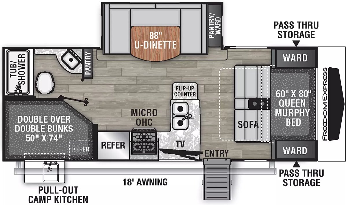 Freedom Express conventional and hybrid travel trailers boast vacuum-bond laminated sidewalls with durable Lami-Lux 1000® fiberglass exteriors backed with Azdel. Available in models from 18’ to 28’, you are sure to find a model that suits your style, whether you are going it alone or taking the whole family.