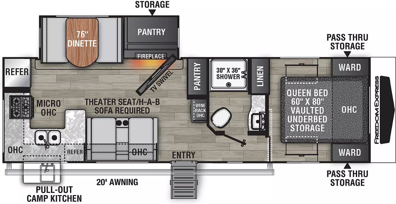 Freedom Express conventional and hybrid travel trailers boast vacuum-bond laminated sidewalls with durable Lami-Lux 1000® fiberglass exteriors backed with Azdel. Available in models from 18’ to 28’, you are sure to find a model that suits your style, whether you are going it alone or taking the whole family.
