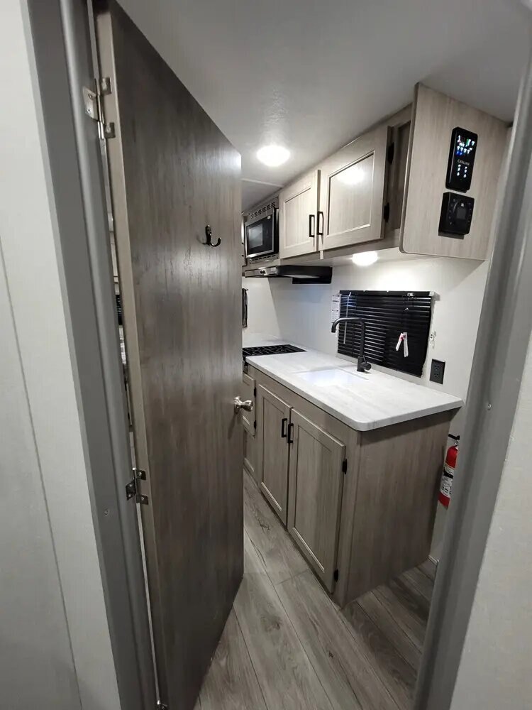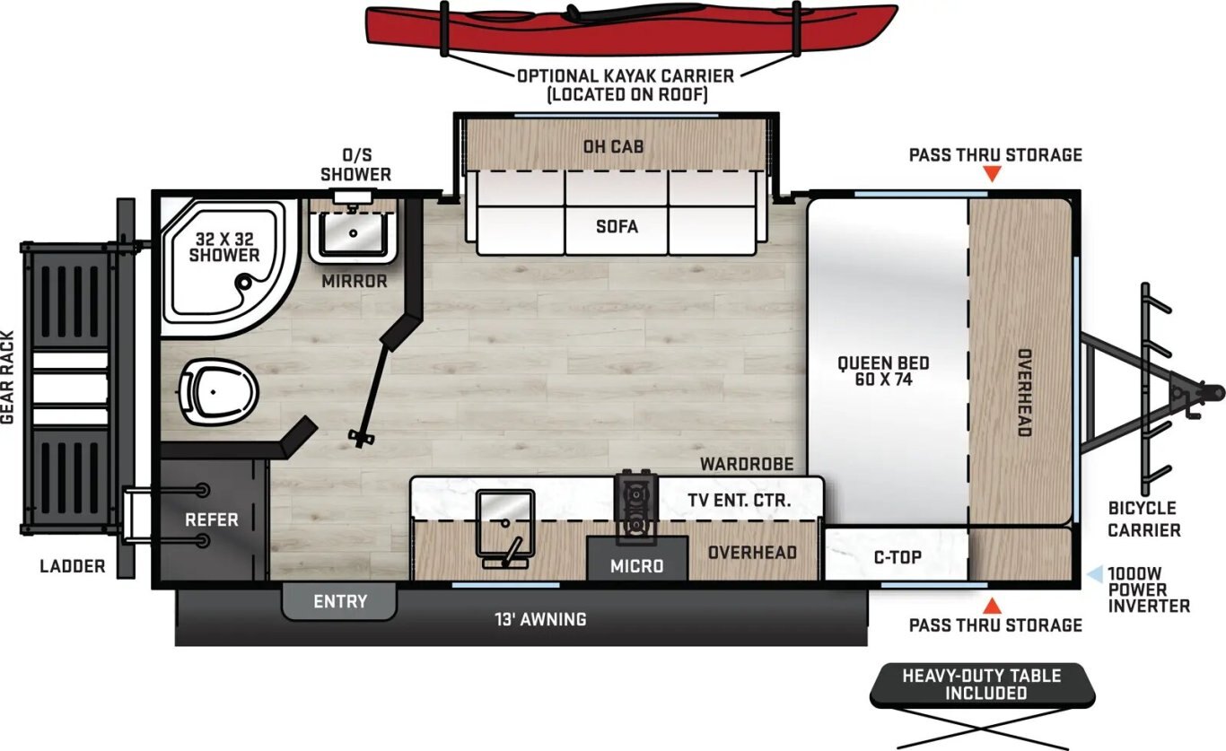 | The 192FQS is for the ultimate adventure seekers! This model is loaded with off road/off grid features and capabilities including two universal solar ports, additional cargo rack & carriers, a water saving system, upgraded torsion axle and off-road tires, a 3” lift for clearance, and 30 Amp to 110V conversion plug attachment for a generator. The floor plan itself provides a full bathroom, amply counter top space, additional seating, and a queen bed! |