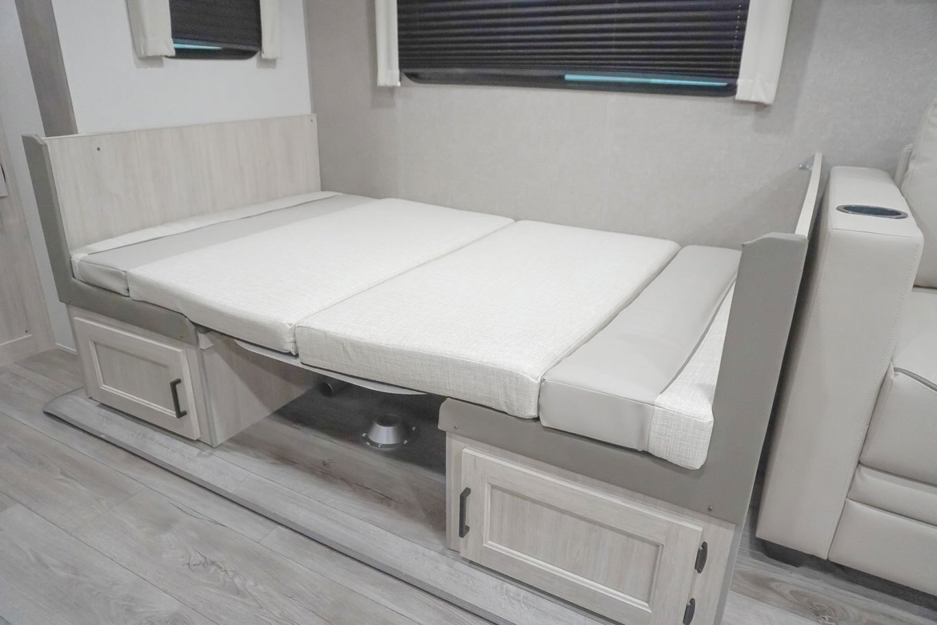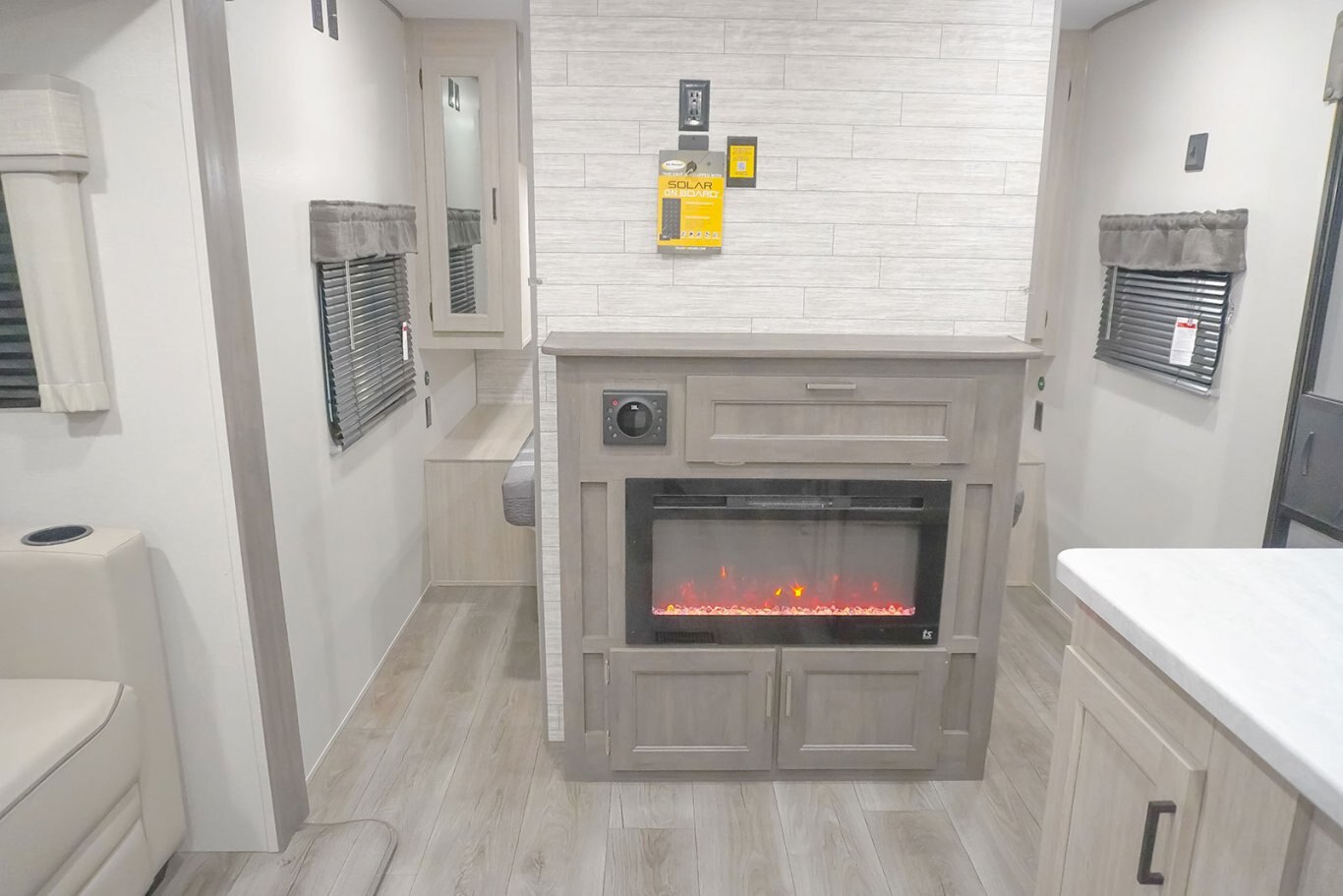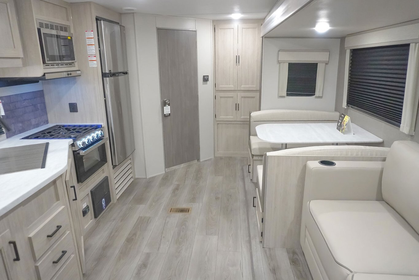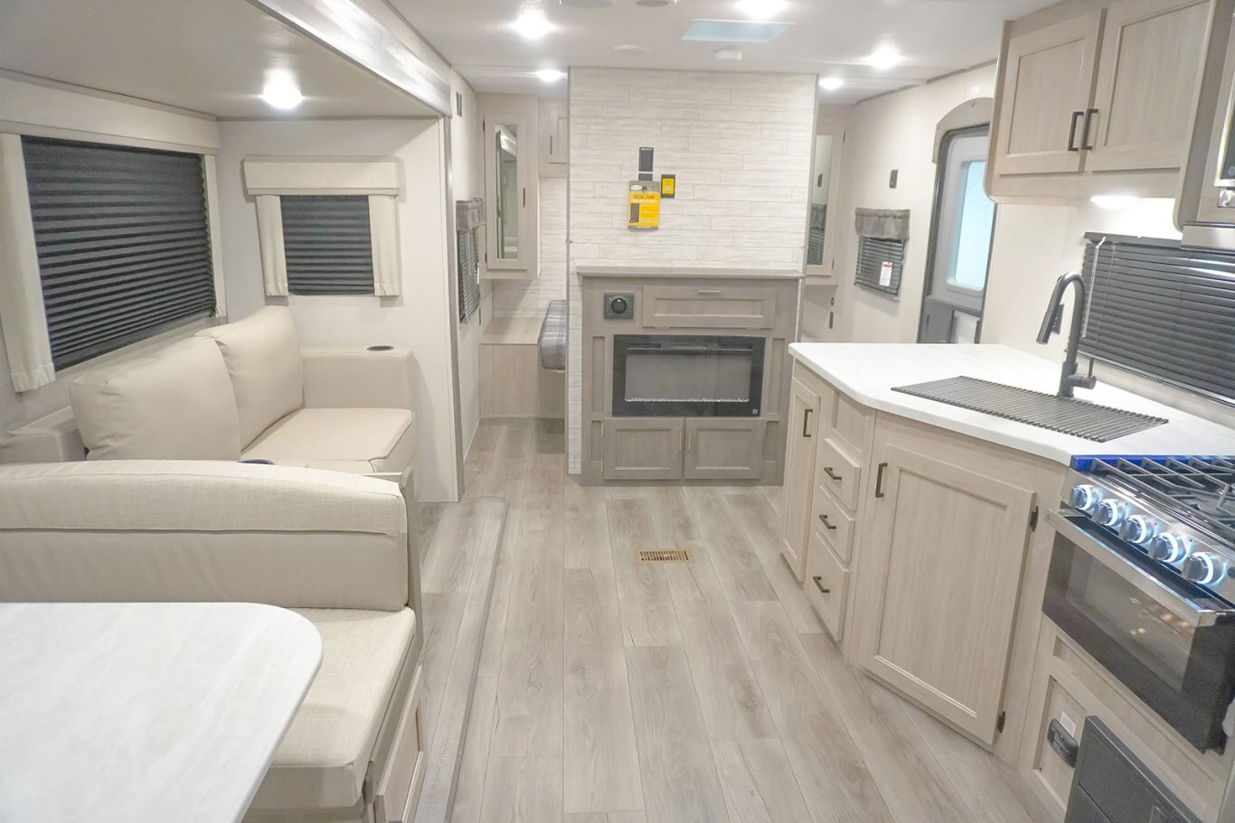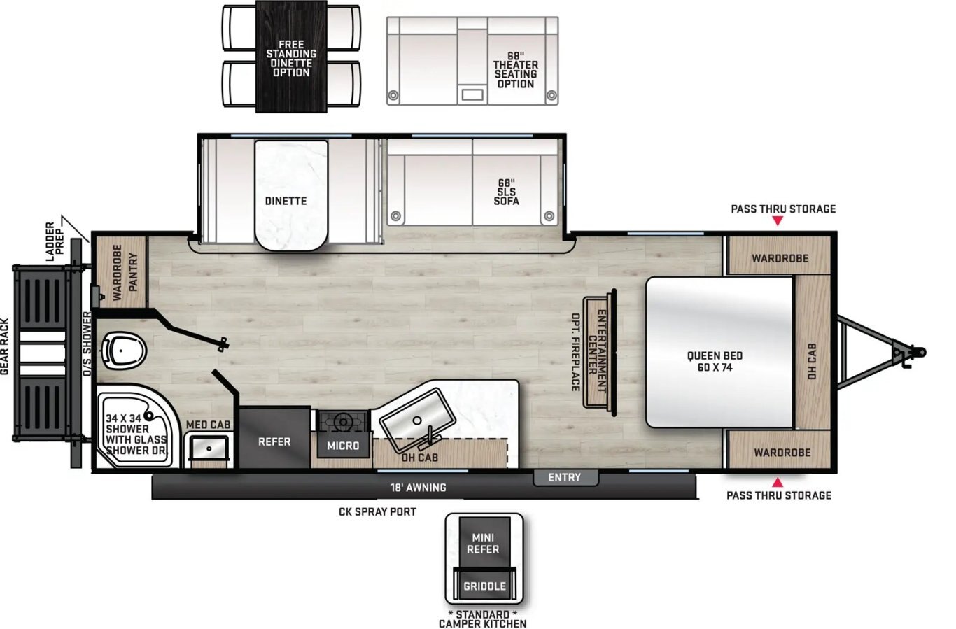 The popular 243RBS is the ideal couple’s coach! This floorplan boasts a full-size super slide with both a dinette and sofa, a spacious rear bathroom with a walk-in shower, extra-large pantry/wardrobe storage, a breakfast bar and private bedroom. The half-ton friendly towing weight and under 30’ real length makes this camper perfect for cross country travel or local weekend getaways!