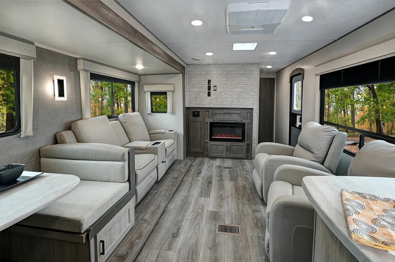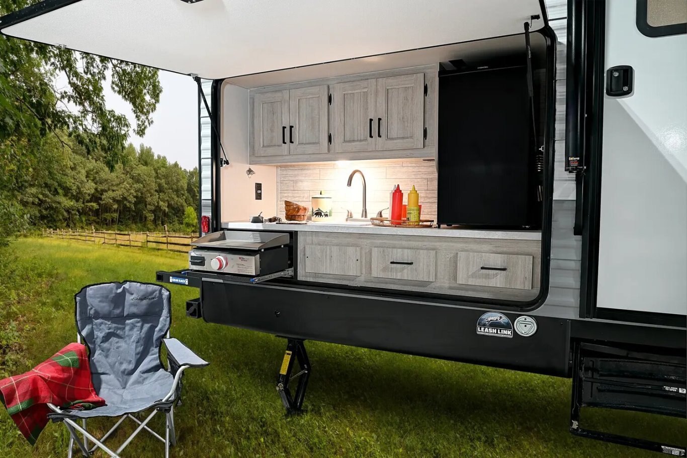 The 323BHDSCK is the ideal bunkhouse floorplan for families of all sizes! The bunk room is furnished with a double size loft bed, a single bunk that can be stowed for more room, the versatile COA cube lounge futon, its own ent. center, and abundant storage. The living room provides a large U-shape dinette and substantial pantry to meet the needs of any family. On the outside our standard large camp kitchen includes a griddle, dorm style refrigerator, sink, plus storage cabinets and drawers.