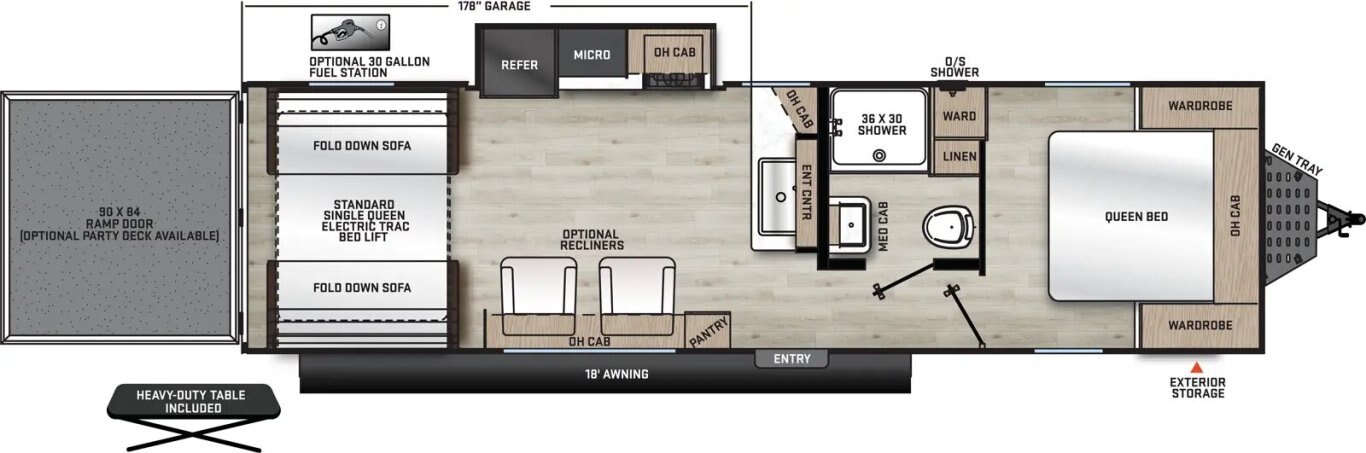 The 28THS leaves nothing more to be desired! Features include a 15’ cargo area, 9 tie downs, taller ceilings, larger fresh water tank, Happijack bunk lift system, and a king bed! The small galley slide opens up the floor plan when you’re camping, and provides abundant storage and counter top space. Popular options include the ramp patio system, 30 gal. fuel station, and our complete solar package. The utility of the floor plan makes it a perfect bunk house for any size family to grow into.
