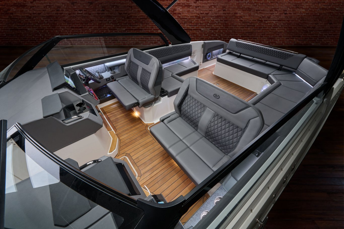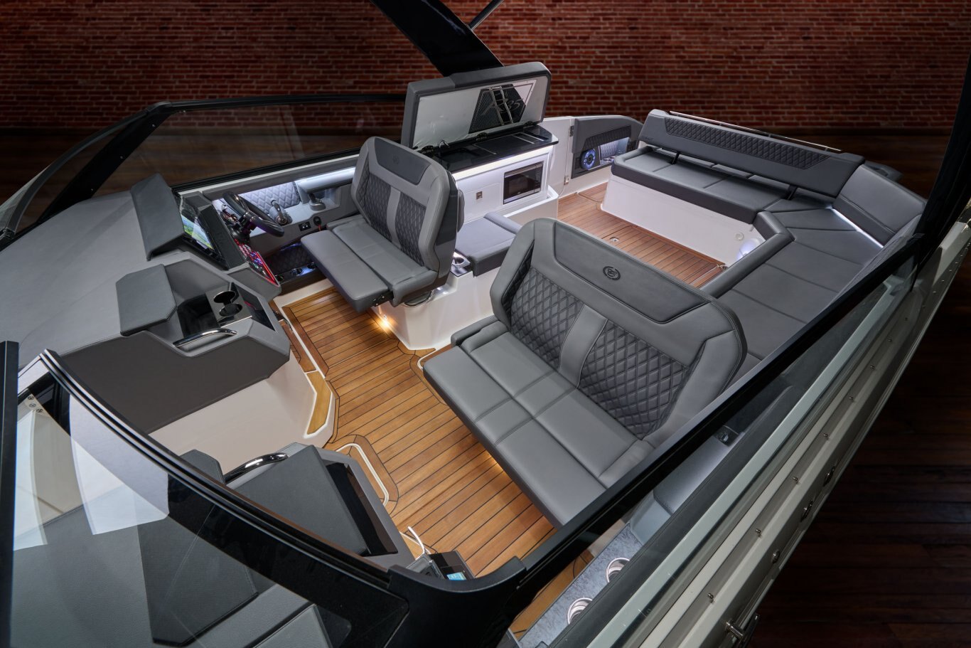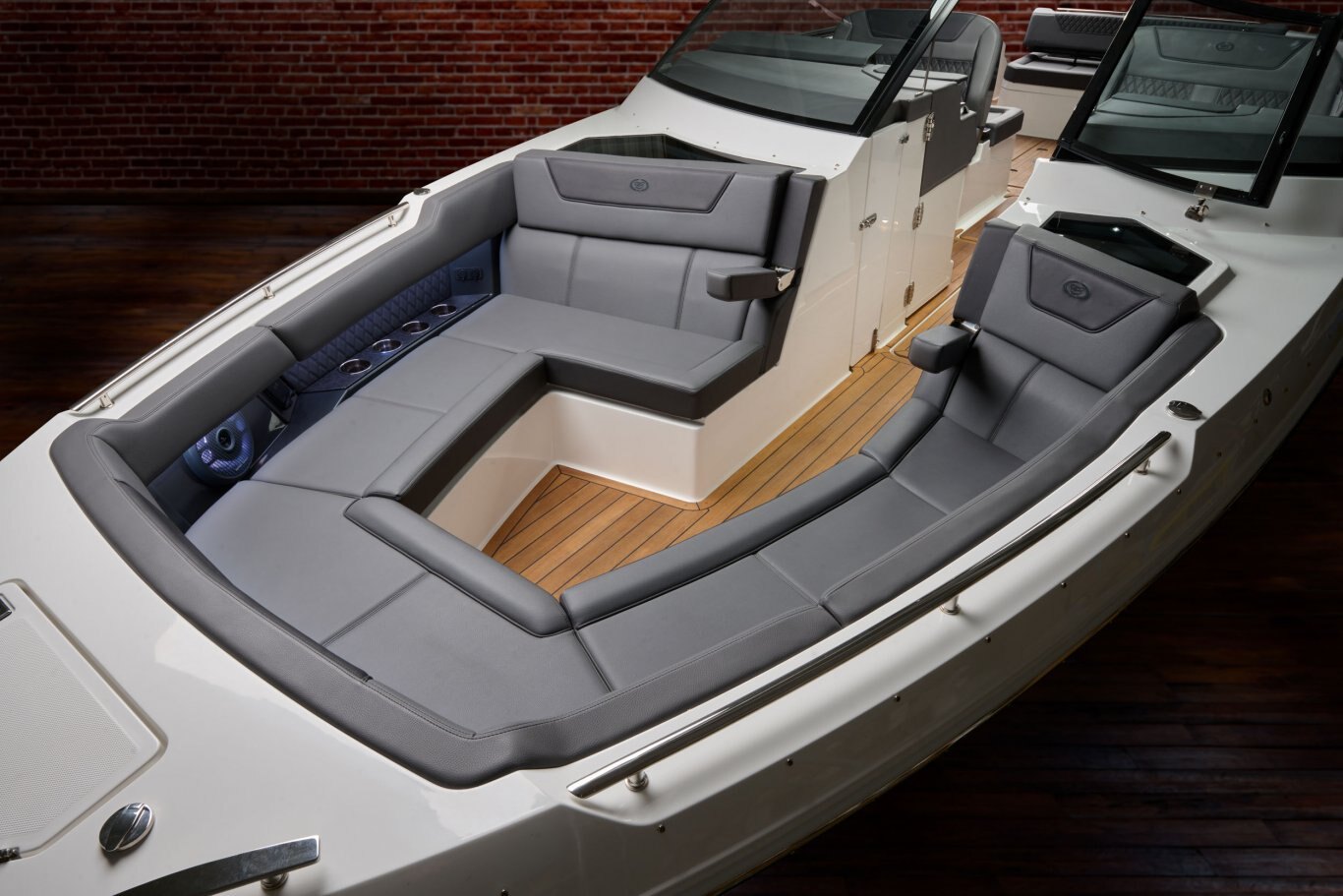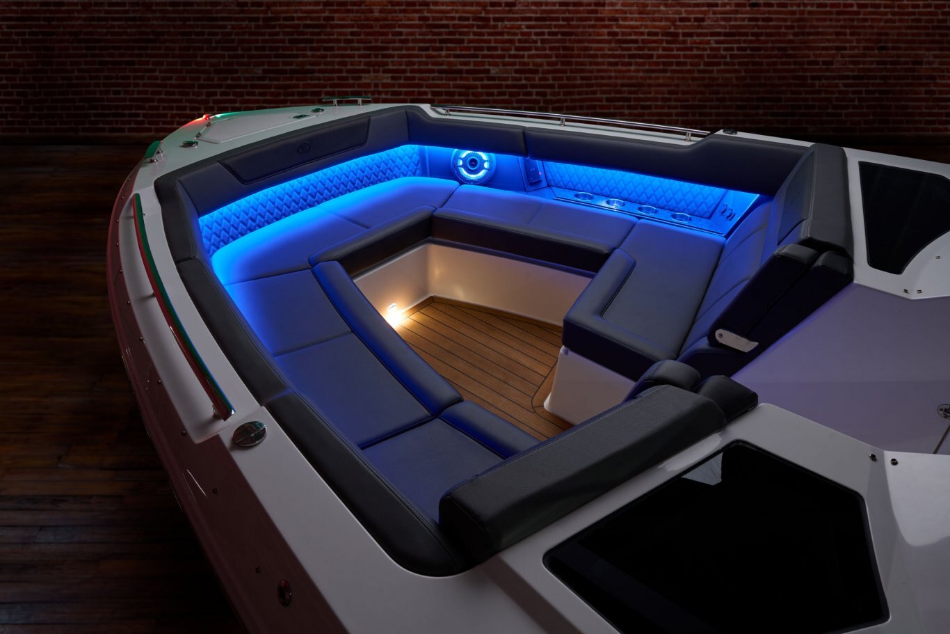 The large cabin accommodates both seating and a full-beam, queen-sized mattress, an optional built-in smart TV and a wealth of ultra-fast USB-C charging stations and cupholders help you anticipate your passengers’ entertainment needs. |