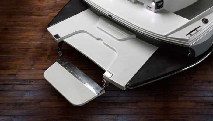Popular and envied, our patented Swim Step lowers below the water line for easy access in and out of the water, is great for lounging, pets, and stows flush within the swim platform surface.