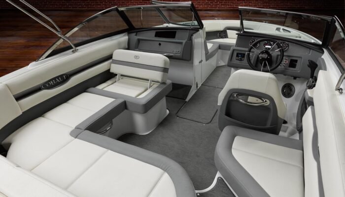 The detailed interior of the CS22 features a wide interior beam, walk-thru transom, digital helm instrumentation, and a six-speaker sound system with Bluetooth capability that allows you to unplug with family and friends for the perfect day on the water.