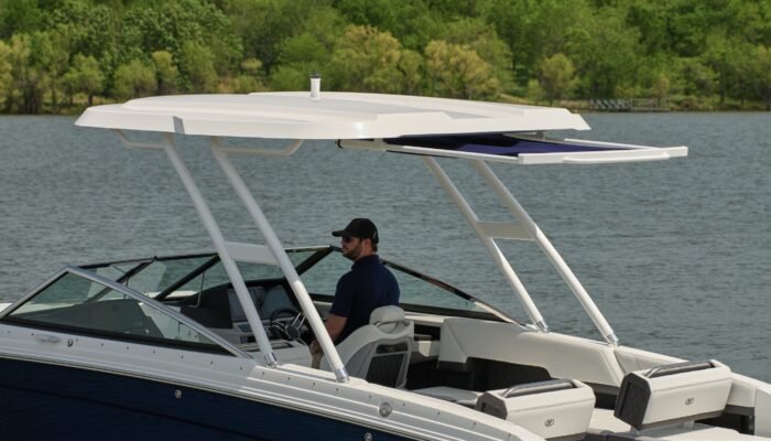 A ridged mounted tower with stretched canvas provides good shade coverage for the cockpit. Additional pull out aft sunshade for extra coverage to rear seating. Unique top available on outboard models only.