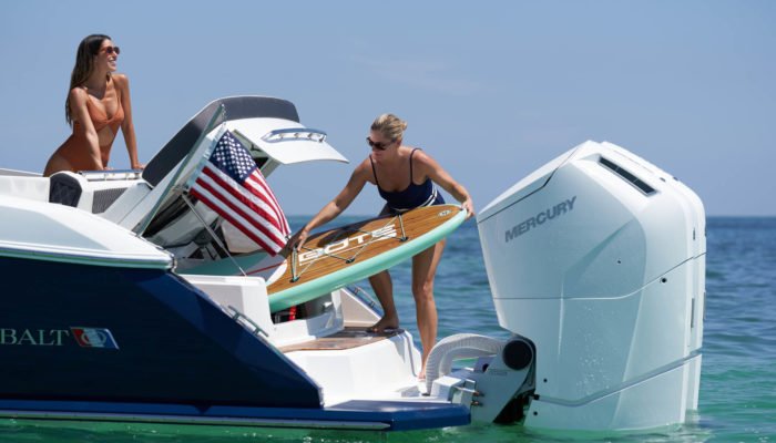 AFT TENDER GARAGE Cobalt has created a fully finished Aft Tender Garage capable of storing two 10’6” BOTE paddleboards and two sea scooters. A large rear hatch allows accessing the toys to deploy to the water, while hatches forward allow access from the cockpit. |