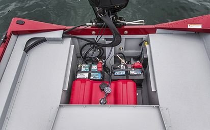 2025 Crestliner 1700 STORM Fire Red Metallic exterior & Gray interior STORAGE STEP