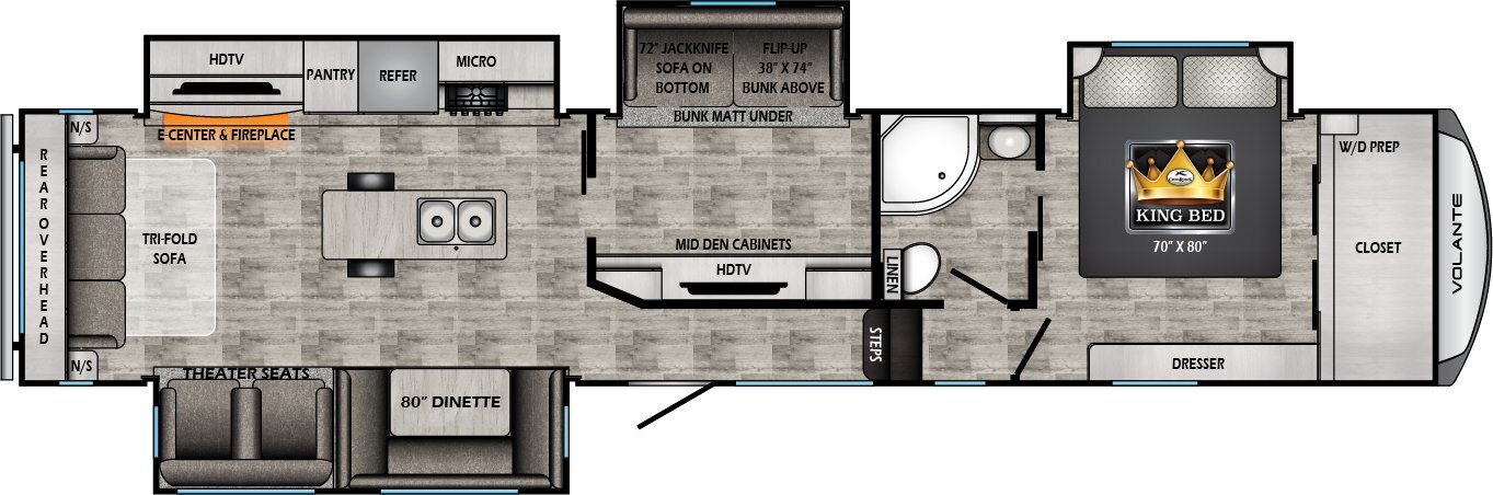 The Volante line was designed simply to enhance your camping experience. Constructed of high quality material in a package that is surprisingly affordable, anyone can experience what the Volante has to offer. A painted front cap, stainless steel appliances, and residential wood blinds are just some of the stunning features that the Volante provides. You already love camping, get ready for that love to turn into an obsession.