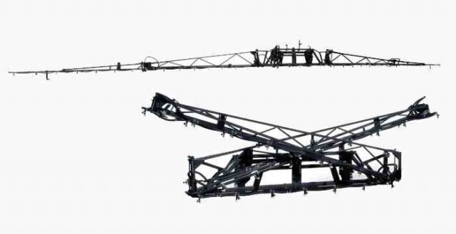 Rear fold boom, all horizontal folding hinges. Less chance of chemical exposure than booms that fold vertically.