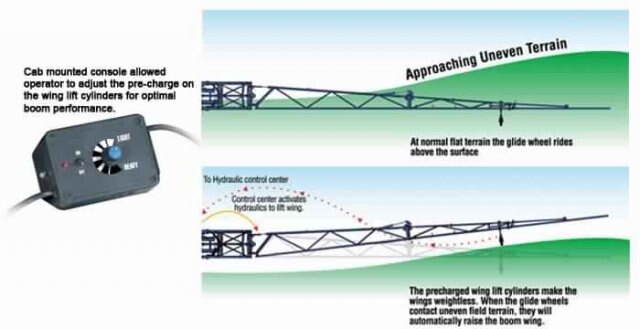Unique hydraulic glide suspension system makes the boom wings weightless. The guide wheels activate the hydraulic system and automatically adjust for uneven terrain. Guide wheels have puncture proof tires. (optional).