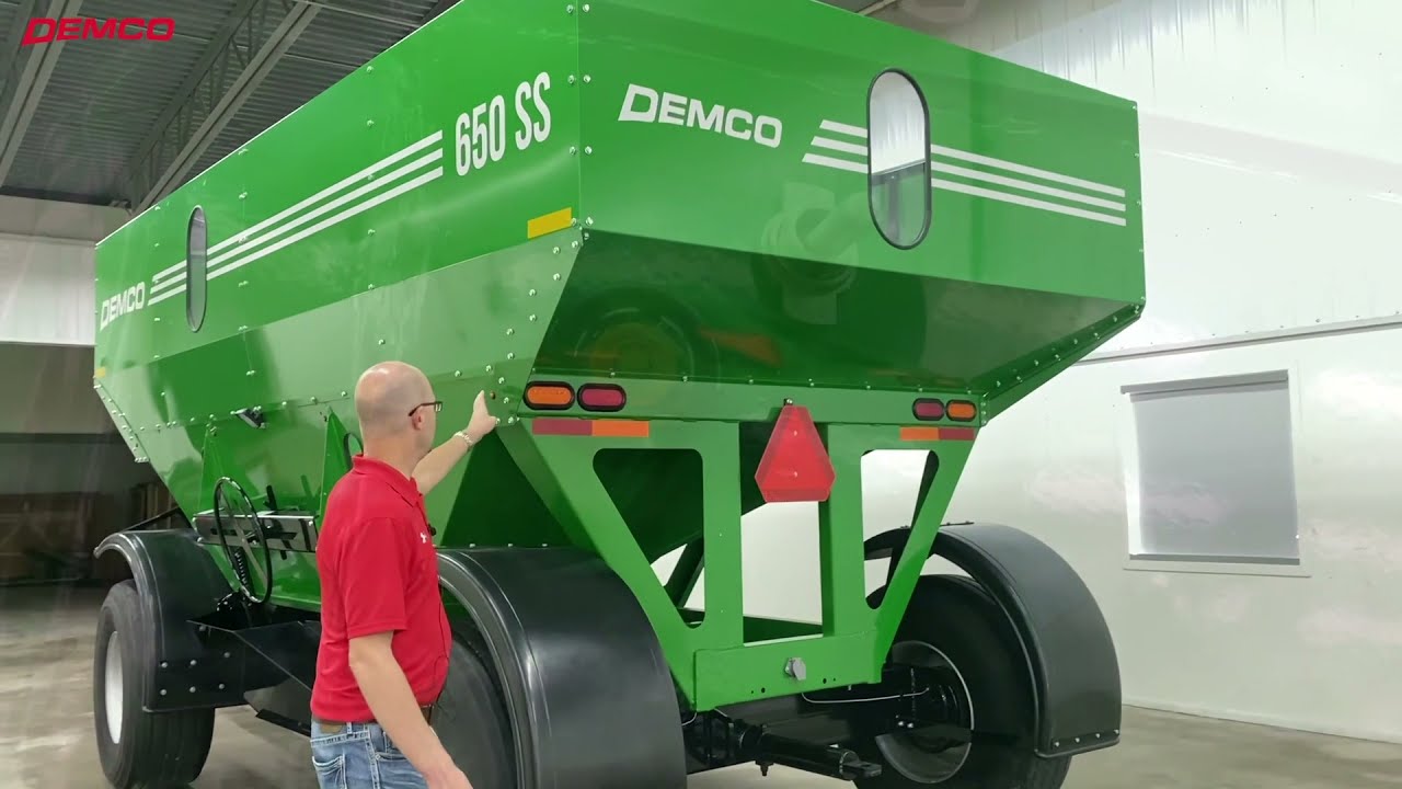 The Demco 650 SS grain wagon offers all the features of the 500 SS, including an easy-open door, dual-side chute access, reflective decals, lights, interior bracing to reduce splatter, large viewing windows, and extra chute clearance. It holds 650 bu with a 108" wide and 17'8" long box, a tight 37' turning radius, and 60" door openings. Weighing 6,700 lbs., it stands 10'2" tall on 22.5 tires with strong 10-bolt hubs. Bushel capacity is based on #2 corn at 15% moisture.