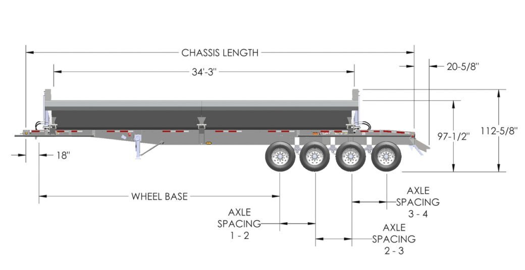 Air Ride: SAF Holland CBX23-245 Air Suspension with Integrated Axles 23K Axles with Wabco ABS brakes (single axle) and 10 bolt hub piloted steel rims, 75,000 lbs. GVW 5" Dia. Dump Cylinder 43K# Payload @2250 psi 1/4" AR450 Steel with trademarked FlexCorner® Design