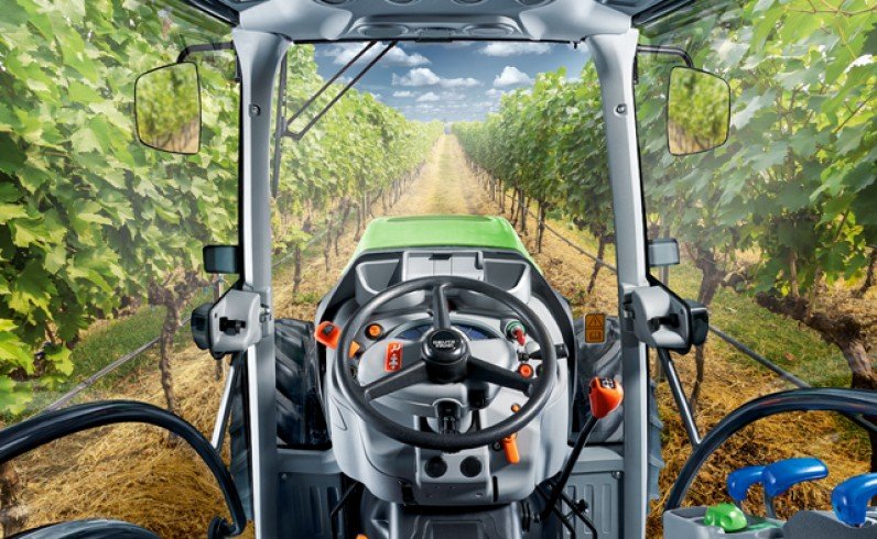 Cab comfort has not been a mere luxury for specialist tractors for some time. A more pleasant working environment means less severe environmental factors such as cold, heat, dust, crop protection agents and noise – and longer periods of concentration and performance for the driver. The four-post cab of the new specialist tractors meets the highest DEUTZ-FAHR standards. Maximum visibility in every direction, covering all areas relevant to work and safety, is ensured by the one-piece windscreen and all-round glazing. Outside, the cab is compact and slim. There are no sharp edges that could damage crops. Inside, a cutting-edge design and high-quality, light materials create a positive atmosphere. The interior is calm and peaceful. With numerous noise-absorbing elements and other technical details, the engineers at DEUTZ-FAHR have succeeded in minimising noise inside the cab. The air conditioning system is powerful, and the air distribution absolutely even. Seven adjustable ventilation nozzles keep the driver’s preferred temperature constant in all parts of the cab at all times. There are new seat options for the driver, including a choice of six versions with different suspension concepts, materials and settings. |