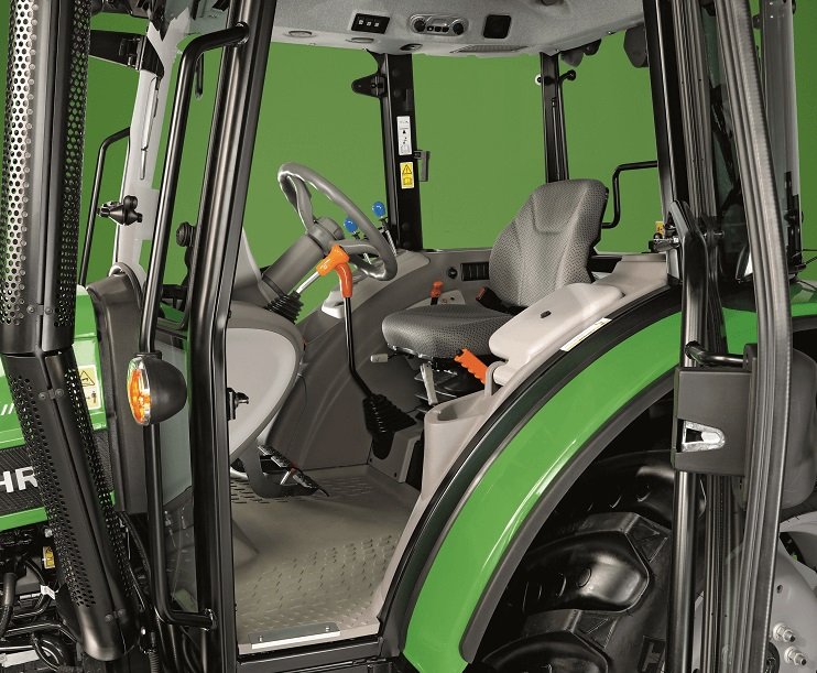The spacious cabin features a large flat rubber floor. A responsive and effective HVAC system keeps the operator comfortable in all conditions.A suspended seat and adjustable steering column makes driving more comfortable. A second trainers seat has plenty of space in the cab. The digital and analog front dash keeps the operator informed. Transmission levers and push button controls are positioned around the tractor for easy reach and operation. Forward work lights in the front hood, and a rear work light at the back of the tractor allow for working at night. 7-pin trailer socket and rear view mirrors are standard equipment. |