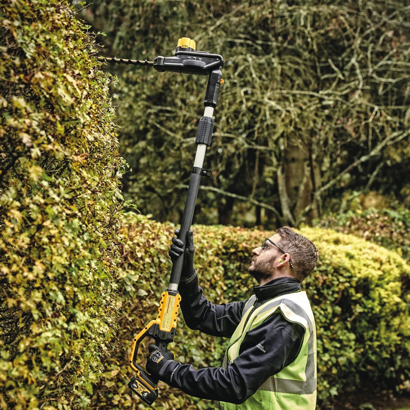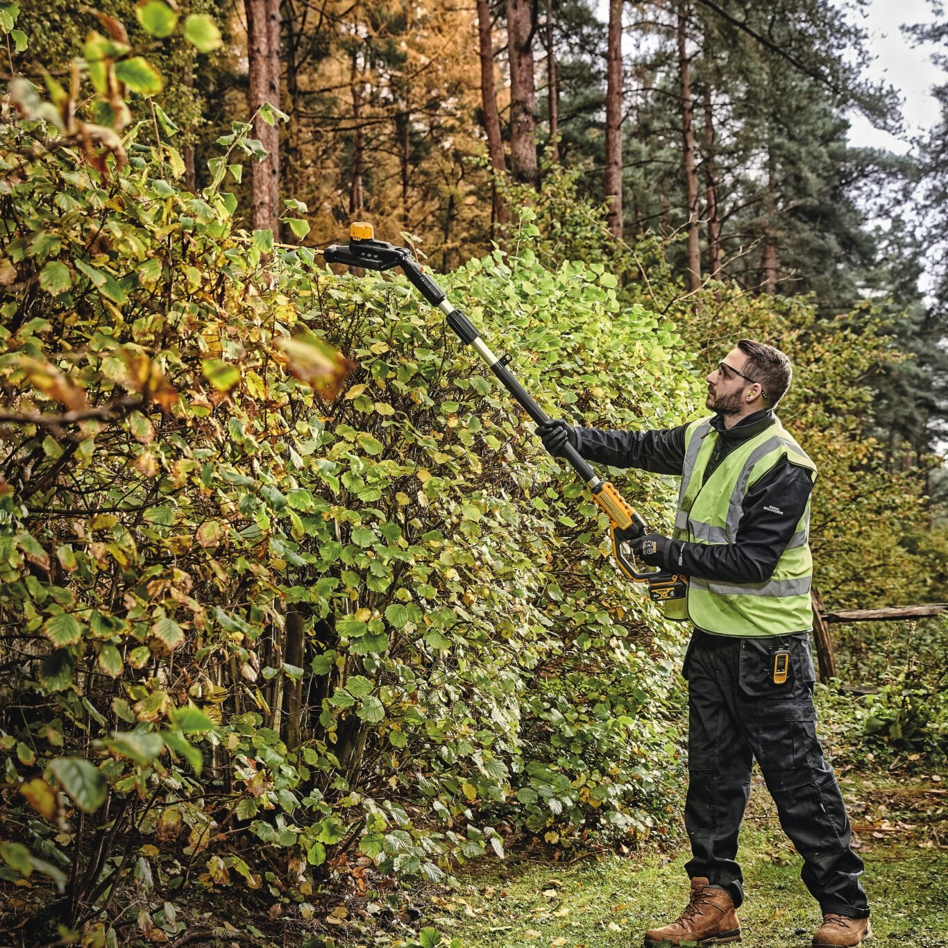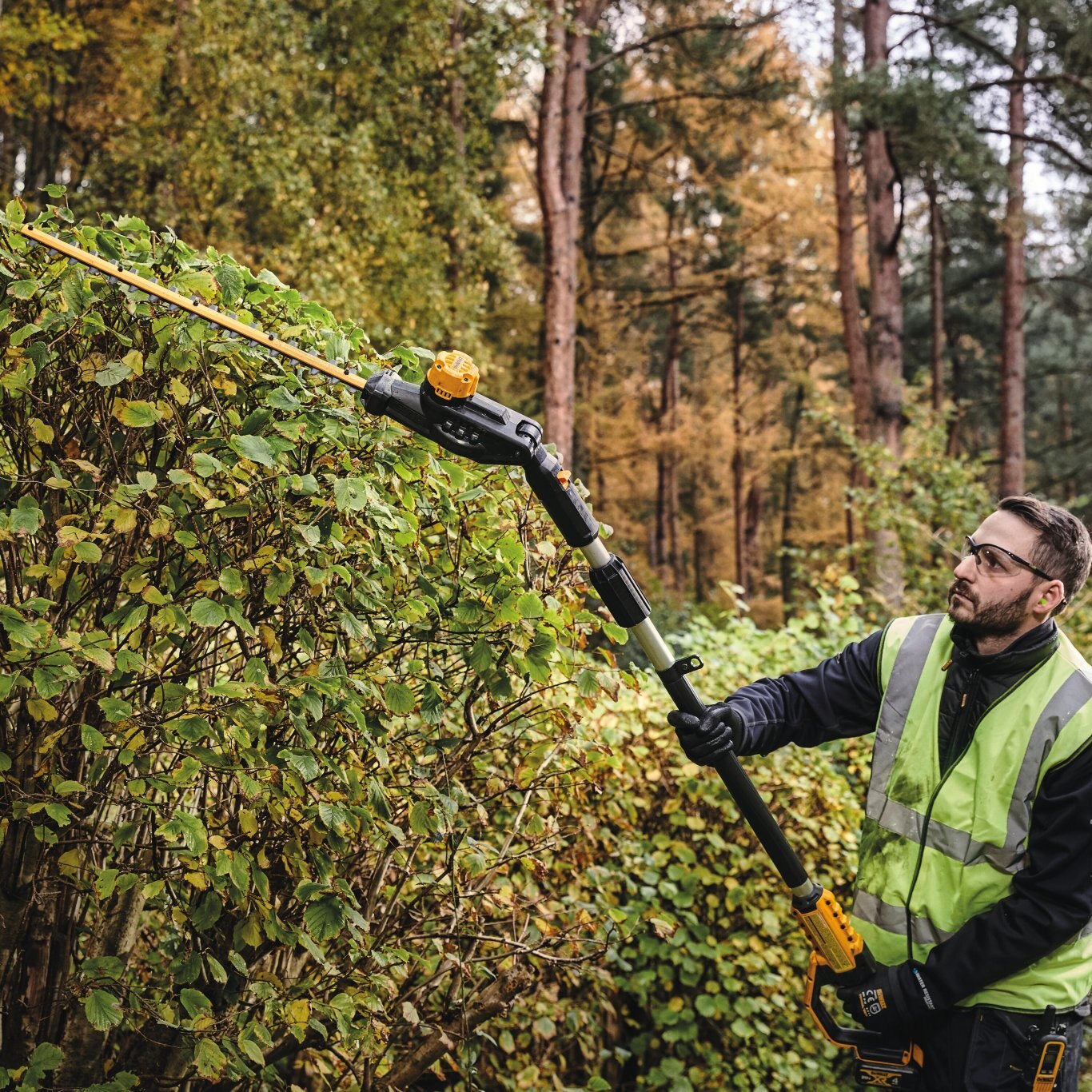 This Pole Hedge Trimmer is designed to cut through a variety of landscape overgrowth. The pole hedge trimmer has a high output motor and 22 in. hardened steel laser-cut blades engineered for clean, fast cuts on branches up to 1 in. thick. The 7-position, 180⁰, articulating head allows you to customize cutting angles for hedges of any shape and size. When fully extended, the pole hedge trimmer can be extended up to a 12 ft. max reach**.