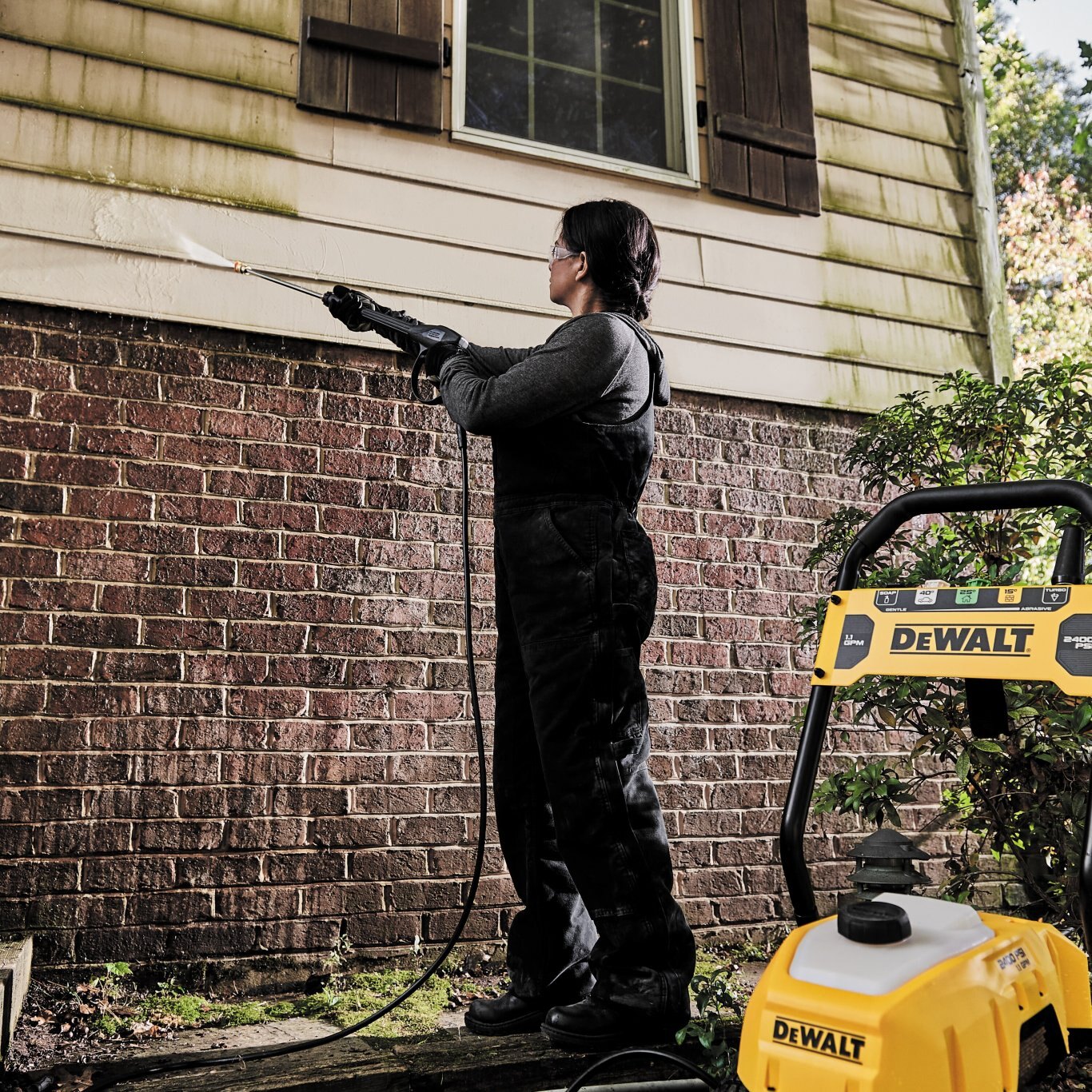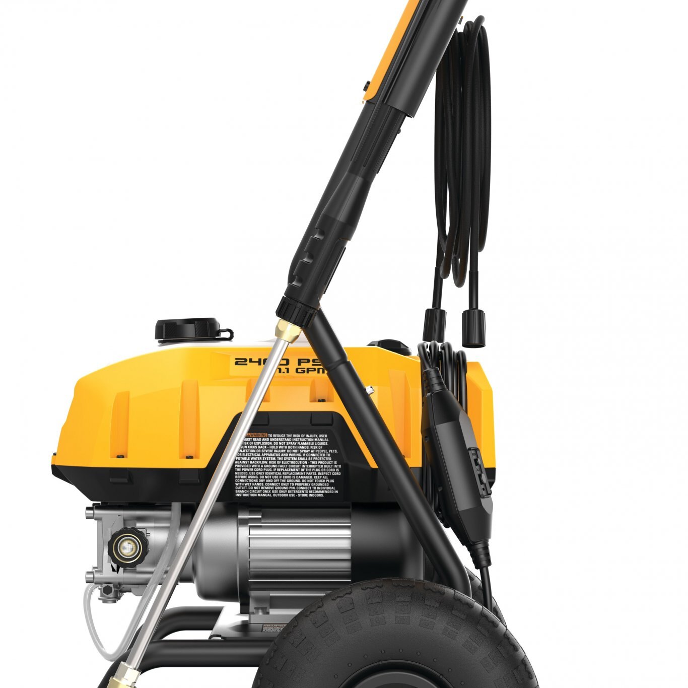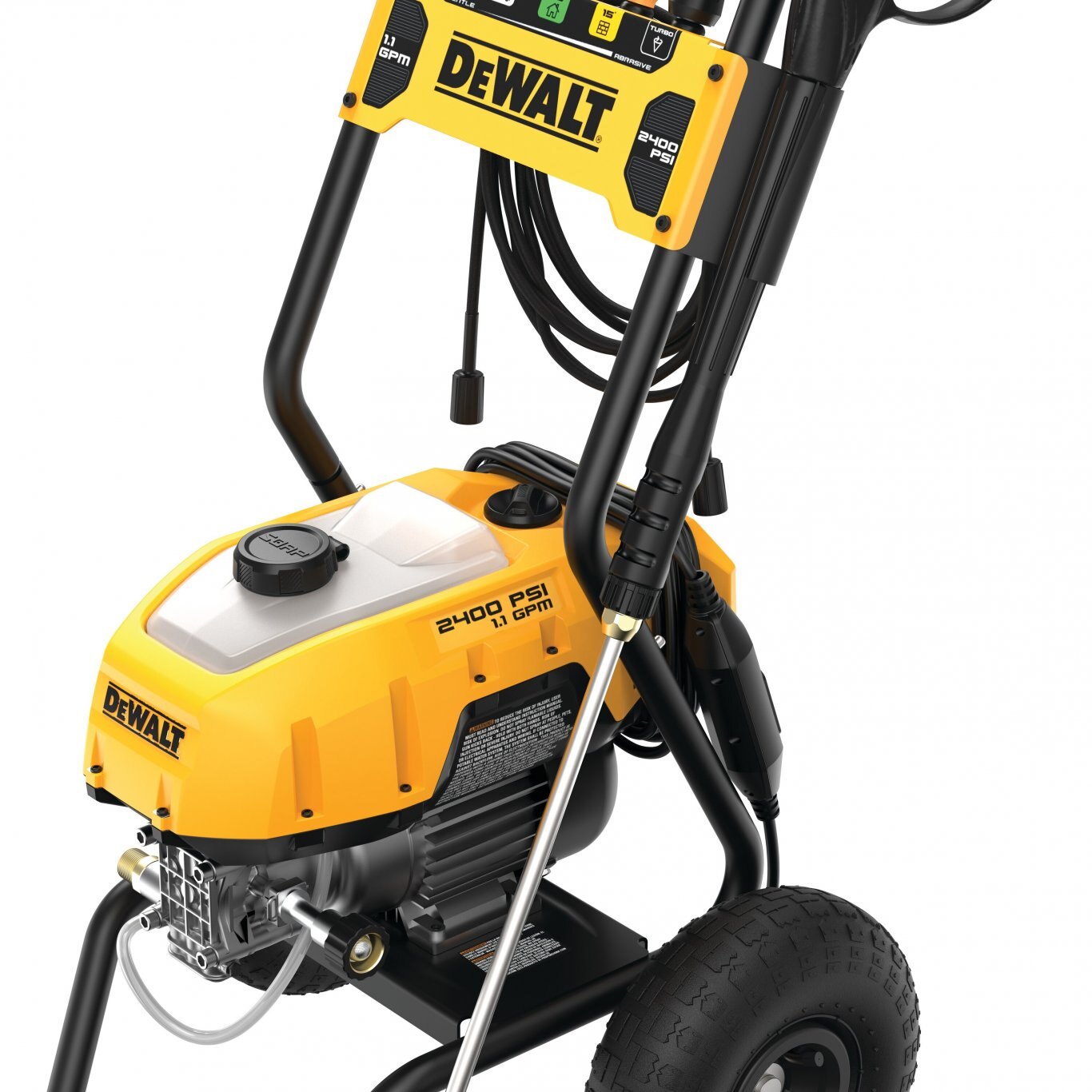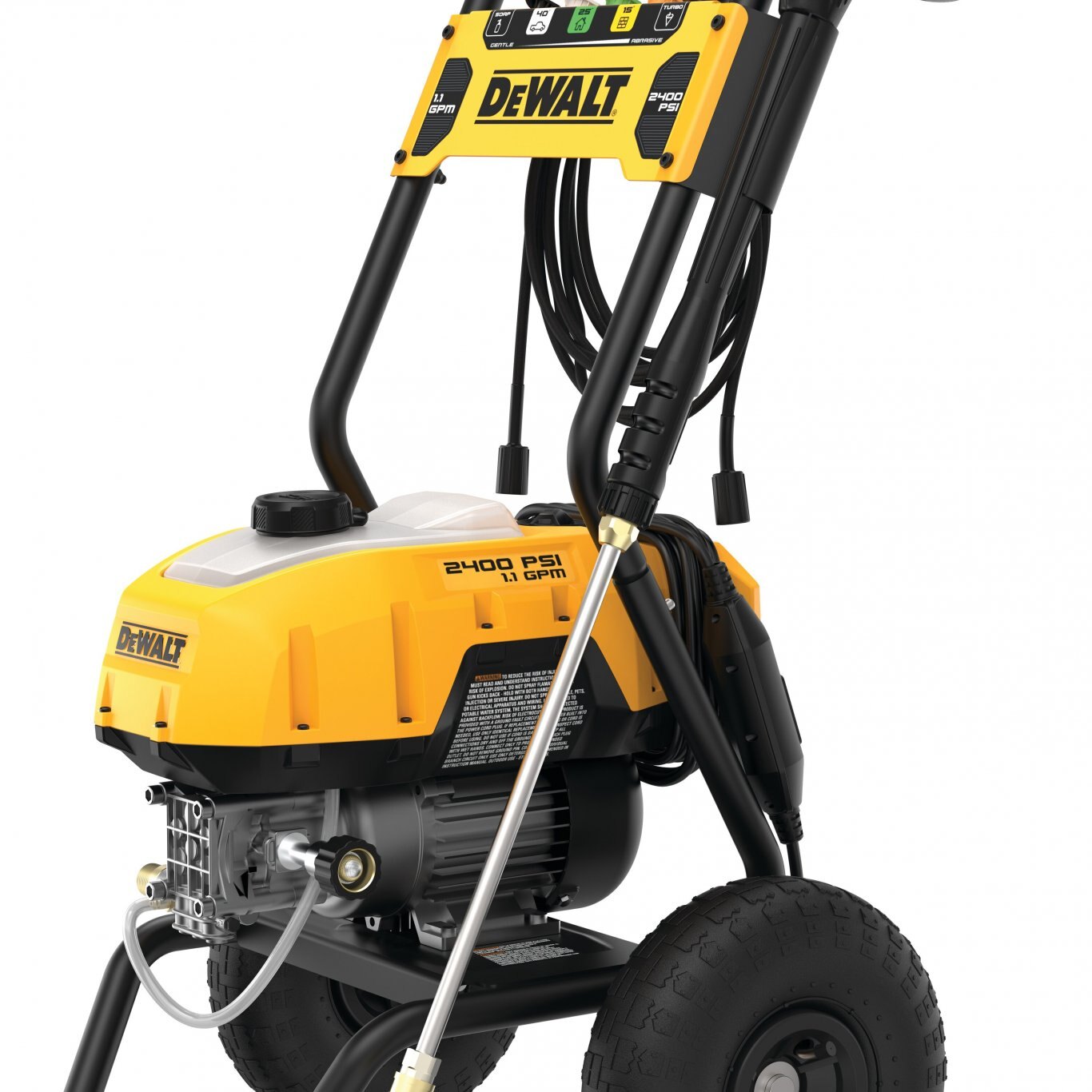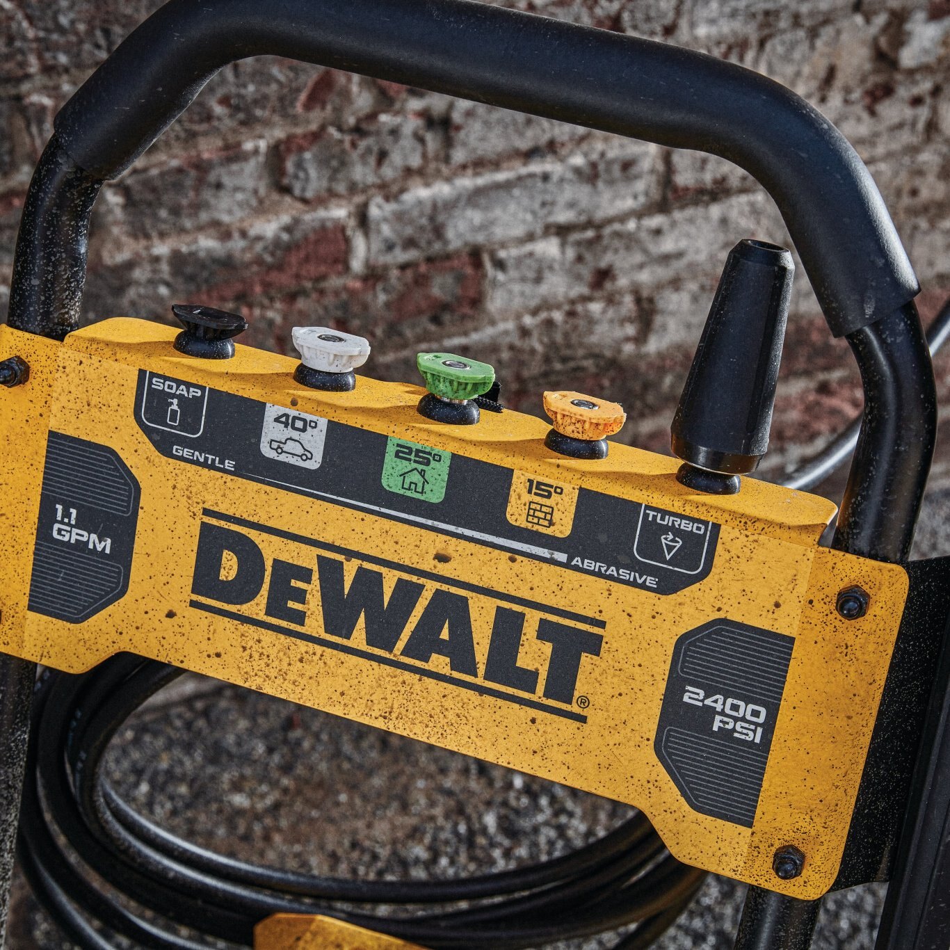 You can rely on the durable, mobile, and powerful DEWALT 2400 psi Pressure Washer, delivering enough power to handle your outdoor cleaning tasks. Be prepared to tackle just about any job or wash your vehicle with the accessories you need. This Cold-Water Pressure Washer comes equipped with five nozzles, including a Turbo nozzle and built-in storage for organization. Built to transport over rugged terrain, the pressure washer features premium 10 in. pneumatic wheels so you can take it to the jobsite. The 2400 PSI Cold-Water Pressure Washer is backed by a 3 Year Limited Warranty.