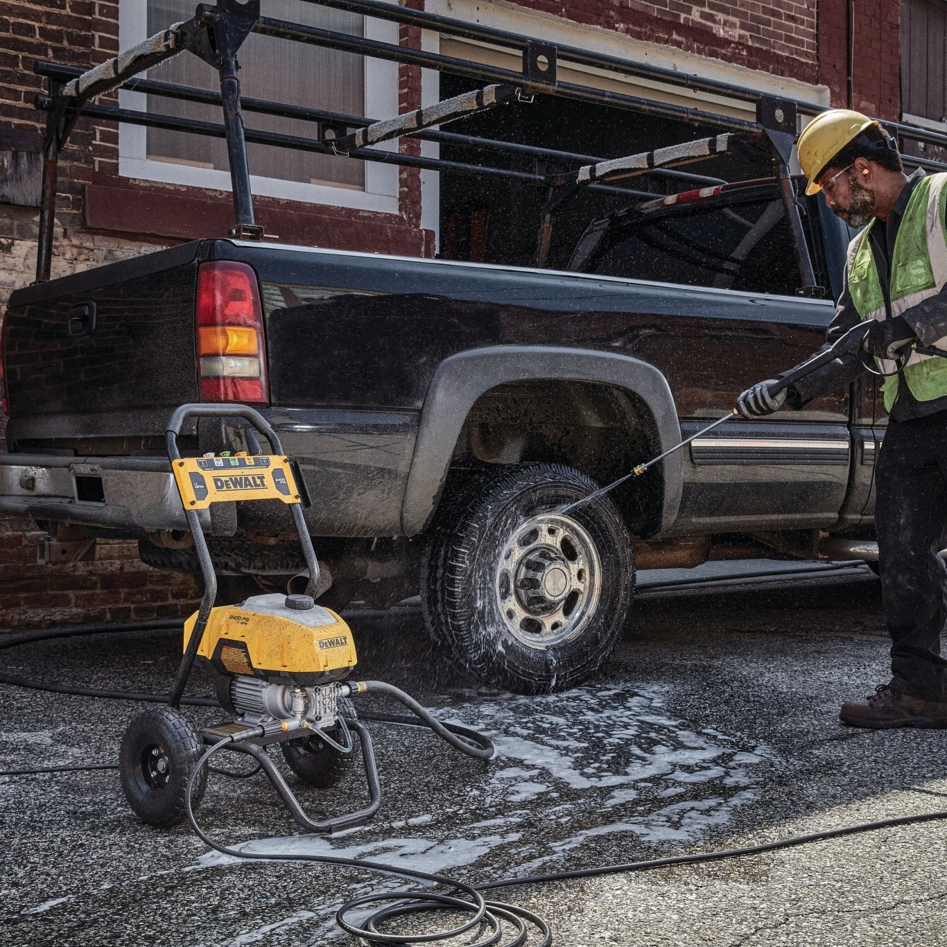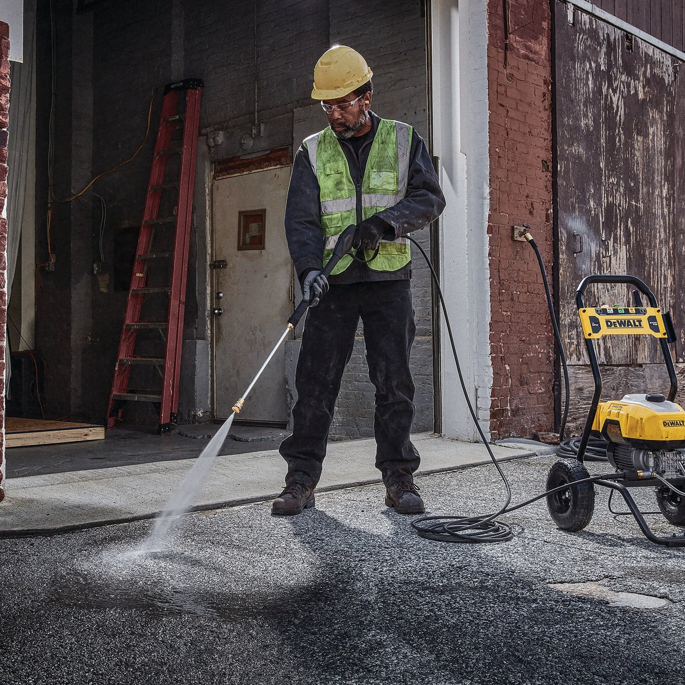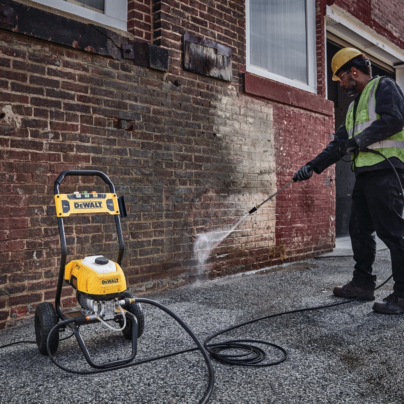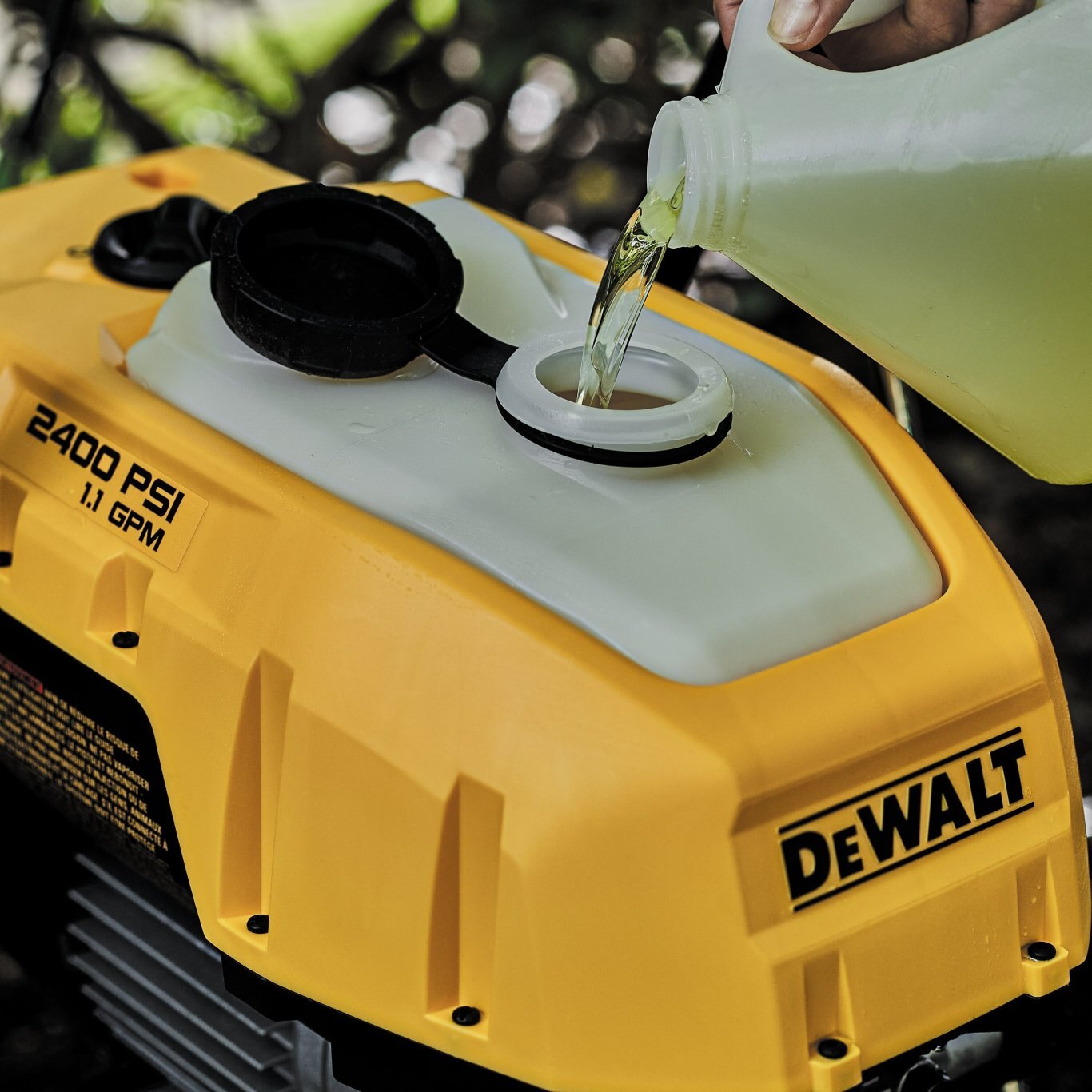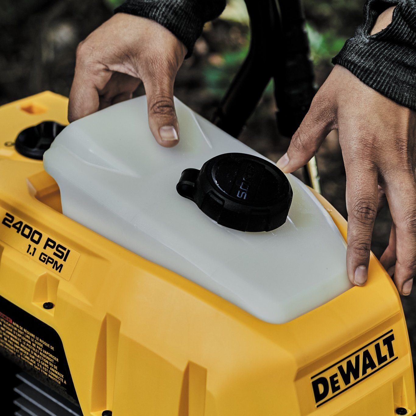 You can rely on the durable, mobile, and powerful DEWALT 2400 psi Pressure Washer, delivering enough power to handle your outdoor cleaning tasks. Be prepared to tackle just about any job or wash your vehicle with the accessories you need. This Cold-Water Pressure Washer comes equipped with five nozzles, including a Turbo nozzle and built-in storage for organization. Built to transport over rugged terrain, the pressure washer features premium 10 in. pneumatic wheels so you can take it to the jobsite. The 2400 PSI Cold-Water Pressure Washer is backed by a 3 Year Limited Warranty.