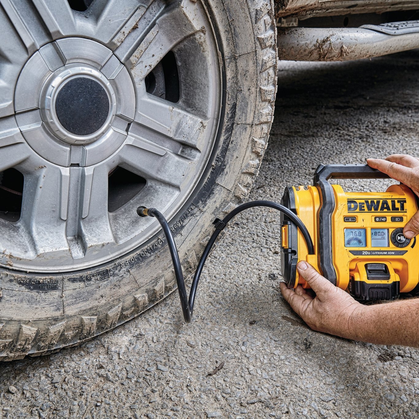 Our 20V MAX* Corded/Cordless Air Inflator can run on any one of three power sources** for maximum versatility: 20V MAX* battery, 12V DC, or 110V AC. Use it on the jobsite, or on the go. It features a high-pressure rubber hose for durability. The threaded chuck and included onboard accessories make it easy to inflate items from tires to footballs. Setting desired air pressure is simple with the digital gauge, and the auto-shutoff provides accurate inflation. The high-volume hose allows fast inflation of mattresses and other inflatables with the push of a button. Move the hose to the deflation port for quick and easy take down. An onboard LED light helps to provide illumination in dark spaces. Heavy-duty rubber feet help reduce walking while in use. **Battery, charger, and AC power adapter sold separately.