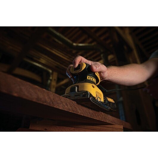 The DWE6411K 1/4 Sheet Palm Sander Kit has a 2.3 amp motor that delivers 14,000 OPM. The separate counterweight reduces vibration and along with the rubber overmold grip provides comfortable sanding. A shorter design allows users to get closer to the work surface and the one-handed locking dust bag attaches securely to the sander to aid in dust collection or the user can attach the sander directly to the DWV010 or DWV012 dust collectors. The new paper clamp holds sandpaper securely during sanding.