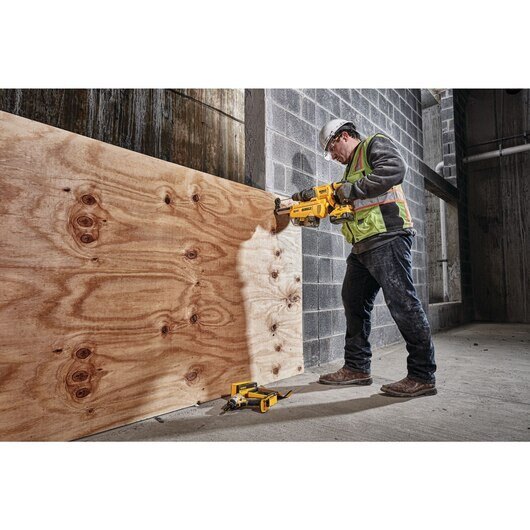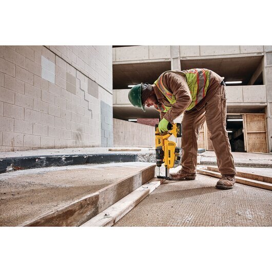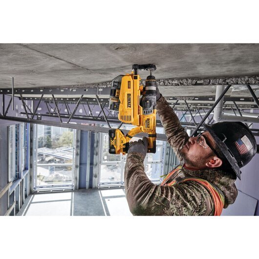 The DCH263R2DH 20V MAX* XR® Brushless 1-1/8 in. SDS Plus D-Handle Rotary Hammer Kit with onboard dust extraction is a light weight, low vibration, high-performance drill designed for the demands of today"s contractor. The durable three mode German engineered mechanism delivers 3.0 joules of impact energy that delivers fast speed of application that professionals require. This allows the DCH263R2 Hammer to perform quickly in chipping applications and have a wide optimal drilling range between 1/4 in. and 3/4in. The DCH263R2DH kit features the 6.0 Ah DCB206 battery pack for extreme runtime. SHOCKS-Active Vibration Control® system reduces vibration felt at the handles, compared to hammers without this feature. With its hard-hitting mechanism, fast drilling speed, long run time and balanced design, this hammer is ideally suited for all day use, even with large diameter hole drilling in the hardest concrete. The DCH263R2DH features the OSHA Table 1 Compliant DWH205DH; This dust extraction system features a powerful built in motor for increased suction and high-performance drilling. The two second power-off delay ensures that dust extraction continues after drill is switched off. The DWH205DH features three nozzle heads for maximum dust collection during the application. The included nozzles are tuned for up to 1 in. diameter bits, all stop bits up to 1.5 in. shoulder and small diameter up to 1/2 in. This dust extractor allows for bit lengths up to 10 in. in overall length for drilling applications. This allows users to install a wide range of anchors including pinch nails, rod hanging systems like dropins, large diameter sleeve, stud/wedge, and screw anchors. This unit includes an OSHA 1926.1153-compliant Dust Box Assembly. Equipped with a filter cleaning mechanism and a HEPA filter, it removes 99.97% of airborne particles 0.3 microns or greater.