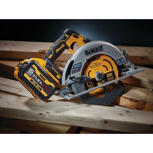 Get more power with the DEWALT® 20V MAX* brushless tools with FLEXVOLT Advantage™ tool technology. The 7-1/4 in. Circular Saw has up to 77% more power when paired with a DCB606 FLEXVOLT® battery vs a DCB205 20V MAX* battery. Battery and charger sold separately.
