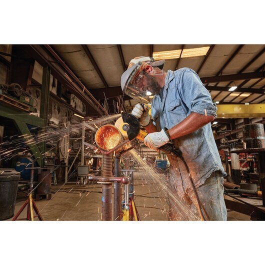 The electronic Kickback Brake engages when a pinch, stall, or bind-up event is sensed, engaging with maximum force to quickly stop the wheel, reduce the movement of the grinder, and shut the motor off