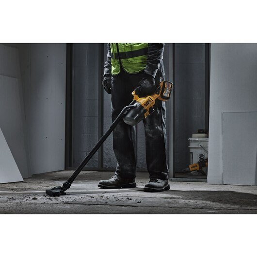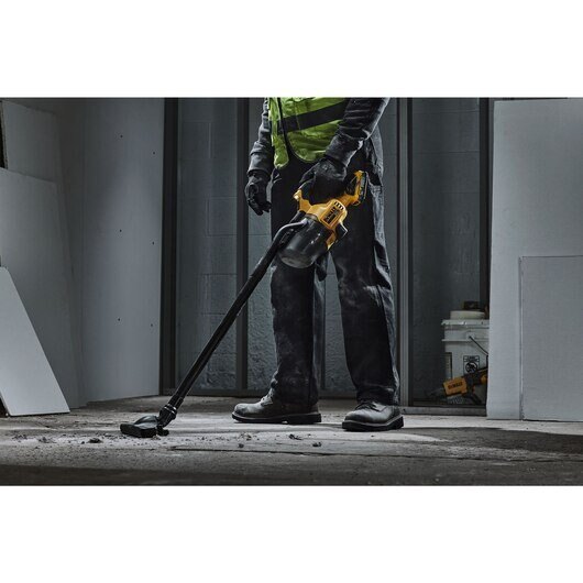 The DEWALT 20V Cordless Dry Hand Vacuum (Tool only) is a jobsite cleaning solution that provides users with powerful performance (46 CFM) to pick up common jobsite debris ranging from drywall, dust, to small screws and nails. This versatile vacuum comes with 6 different cleaning attachment accessories to tackle any cleaning job from floor level to overhead. The hand vacuum can be used to handle smaller messes or used in combination with the extension tube and floor accessory to clean up floor areas. A bright LED light illuminates the darkest areas. A HEPA Filter allows for clean efficient cleanup of fine dust and drywall and follows OSHA Table 1 Compliance under houskeeping rules. It comes fully equipped with an extension tube, floor nozzle, flexible hose, crevice nozzle, gulper brush, round brush, belt hook, accessory holder, and HEPA filter.\n\nUp to 21.4 mintues of runtime per charge using DCB205 battery (sold separately).\n\nCan fill up to 15 tank fills per charge using DCB205 battery (sold separately).