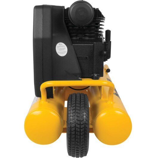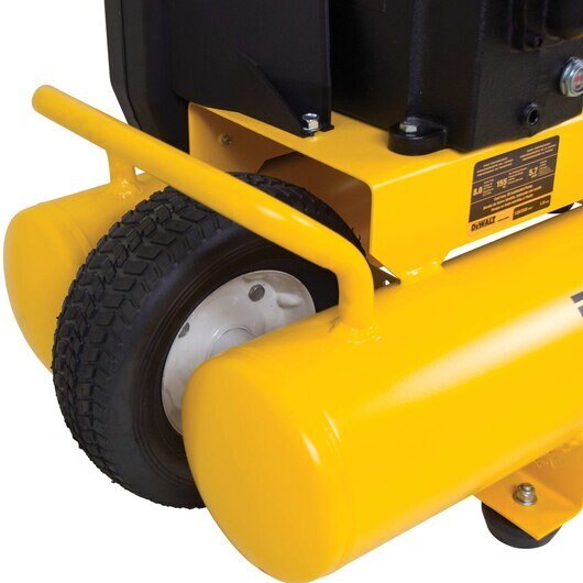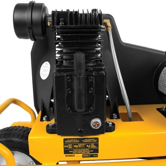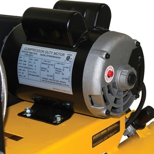 The DEWALT 8 Gallon Air Compressor has a powerful and reliable 1.9 HP heavy-duty induction motor, helping to ensure trouble-free operation with an easy start and the ability to drive high-pump performance. The cast iron, twin cylinder pump with a thermally stable cast iron twin cylinder body and valve plate delivers a surge of air power and recovery needed to run extra nailers. A fully enclosed metal belt guard covers and protects moving parts, while a ball drain valve allows for quick and thorough tank draining.