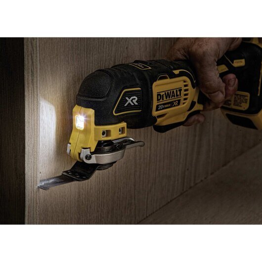 The DCS355B 20V MAX* XR® Lithium Ion Oscillating Multi-Tool has a powerful brushless motor providing up to 57% more run time over a similar brushed tool. The Quick-Change™ accessory system allows you to change blades quickly and easily, and with the universal accessory adaptor, it's compatible with most oscillating tool accessories. The DUAL-GRIP™ Variable Speed Trigger provides ultimate speed and application control, the DEWALT Oscillating Tool Guide System allows you to customize the depth or height for accurate repeatability, and the bright LED light illuminates dark work spaces. Included with this bare tool is a universal accessory adaptor and two wood cutting blades to help get your project started. Battery and charger sold separately.
