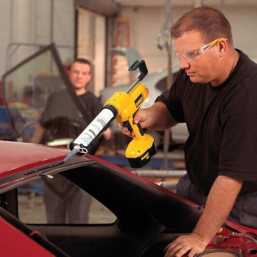 The DC545K 18V Cordless Adhesive Dispenser rotates 360 degrees and delivers up to 650 pounds of force to dispense the highest viscosity of adhesives and sealants. It has low maintenance and a variable speed control for consistent flow rates.