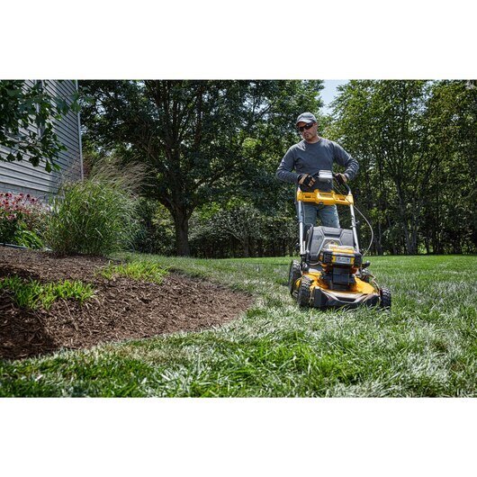 Designed to quickly cut large yards, this 2X20V MAX* Brushless Cordless 21-1/2 in. Rear Wheel Drive Self-Propelled Mower delivers mowing power and ease of use when tackling demanding yardwork. Auto-sensing technology helps you maintain high rpm while working for steady cutting even when mowing dense, thick grass. Mulch, bag, or use the side discharge with 3-IN-1 functionality and conveniently transport or store when the job is done using the fold-over handle and lift handle.
