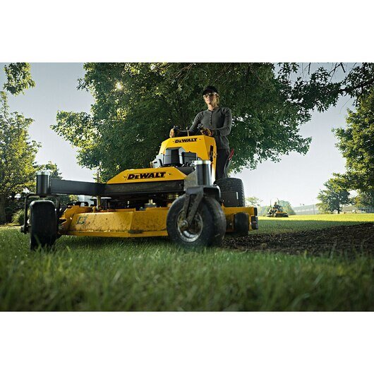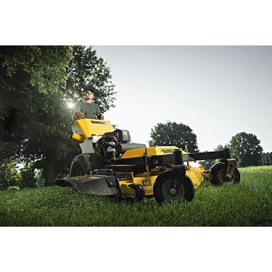 Built for daily use with heavy-duty construction and thick frame components, the DEWALT 48 in. Hydro-Walk Mower is the ideal choice for lawncare professionals. Operators can employ quick, on-the-fly speed adjustments with single-lever infinite speed control that goes from 0 to 7 mph in forward and up to 3 mph in reverse. Tackle more with contoured controls that reduce fatigue and dampen vibration to go from lawn to lawn with ease. This mower conveniently keeps tracking straight even on rugged, hilly terrain with a low center of gravity and wide wheelbase. Efficiently adjust cutting depth with quick deck height adjustment so no time is wasted. Smooth handling is made possible by hand-lever steering control with ball bearing linkage so you can tightly maneuver around trees and flower beds for precise trimming.