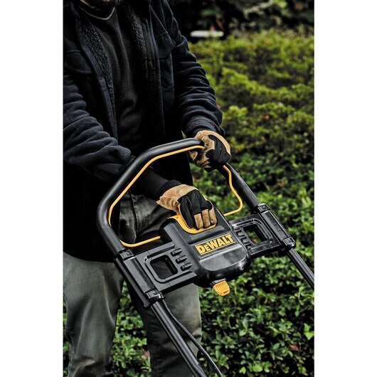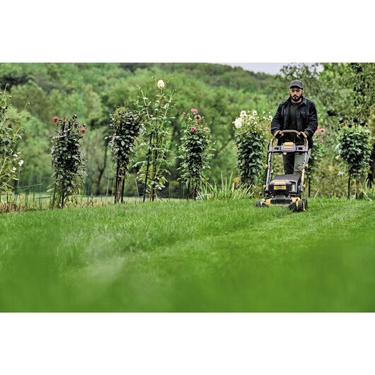 Get more done with the DEWALT 2X20V MAX* 21-1/2 in. push lawn mower. Featuring a direct drive motor that delivers up to 75 minutes of runtime, you can cut through thick grass with ease. Innovative, auto-sensing technology lets you maintain high RPM whether you"re mulching, bagging, or using the side discharge. The unit takes up 70% less space with integrated vertical storage compared to the space it requires in operation. Easily maneuverable, this mower is equipped with a dual-lever height adjust along with handy lift handles for quick transportation.