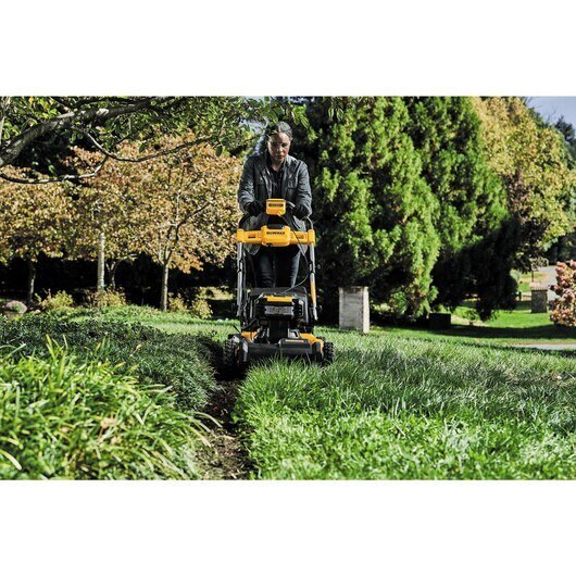 Featuring a brushless, direct drive motor that delivers up to 60 minutes of runtime in one charge**, this self-propelled lawn mower has the power you need to get the job done. Innovative, auto-sensing technology achieves higher rpm so you can cut thicker grass whether you are mulching, bagging, or using the side discharge. With a fold-over handle for convenient transport and integrated vertical storage, this cordless mower takes up 70% less space in your garage than it does when in operation. Count on the DEWALT FWD Self-Propelled Lawn Mower to deliver the power needed to tackle your lawn in comfort.