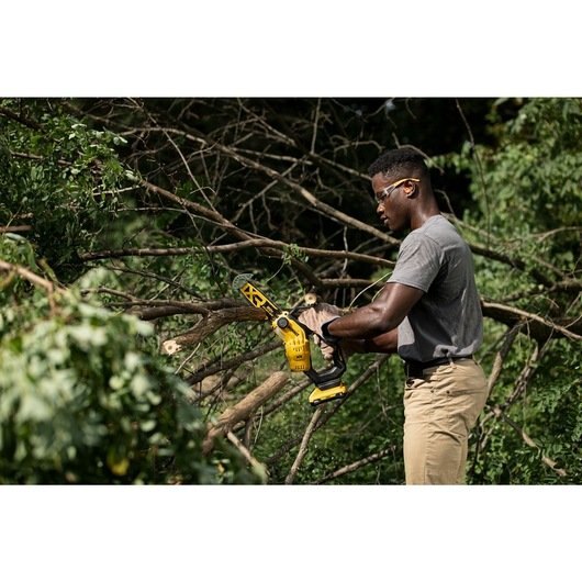 Lightweight and compact, the 20V MAX* 8 in. Cordless Pruning Chainsaw has a high-efficiency brushless motor designed to maximize runtime and motor life with up to 70 cuts per charge.*** Weighing just 4.6 lbs (tool only), the Pruning Chainsaw is 61% lighter** and 3x more compact,** designed to reduce fatigue while cutting, trimming and pruning. Use it to trim branches from downed trees, cut bundles of wood or branches, and manage thick brush or daily pruning needs. Compact design allows for easy access to tight spaces. Integrated tip guard is designed to provide stability during upcuts, and onboard wrench allows for tool-free tensioning. Kit includes (1) 20V MAX* DCB230 3 Ah battery, charger, tensioning tool and bar sheath.