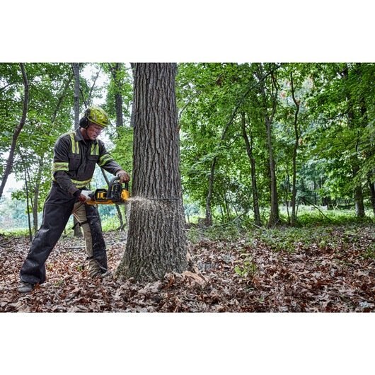Cut, chop, and sculpt with ease using the durable 60V MAX* Brushless Cordless 20 in. Chainsaw. With a peak horsepower of 4 HP using a DCB615 battery (sold separately), this rugged Chainsaw packs the sawing power and dependability needed for routine sunup to sundown workdays. Tighten the chain as needed for steady bar retention while the brushless motor delivers high-efficiency performance with auto-oiling for continuous lubrication. Kick back protection is provided by the chain brake bult-in with the low kick back bar and chain.