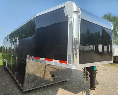 Discovery Aluminum Gooseneck Stacker Featuring Poly-Cor Exterior Panels. Discovery Aluminum Gooseneck Stacker Featuring Poly-Cor Exterior Panels Triple Tandem Axles, Awni...