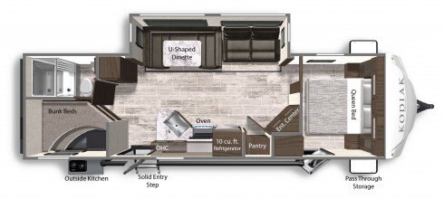 All the thrill of getting away combined with premium space and traditional comforts. That’s what a residential 60”x80” queen-size bed brings to adventurers in every floorplan of our Kodiak Ultra-Lite travel trailers.