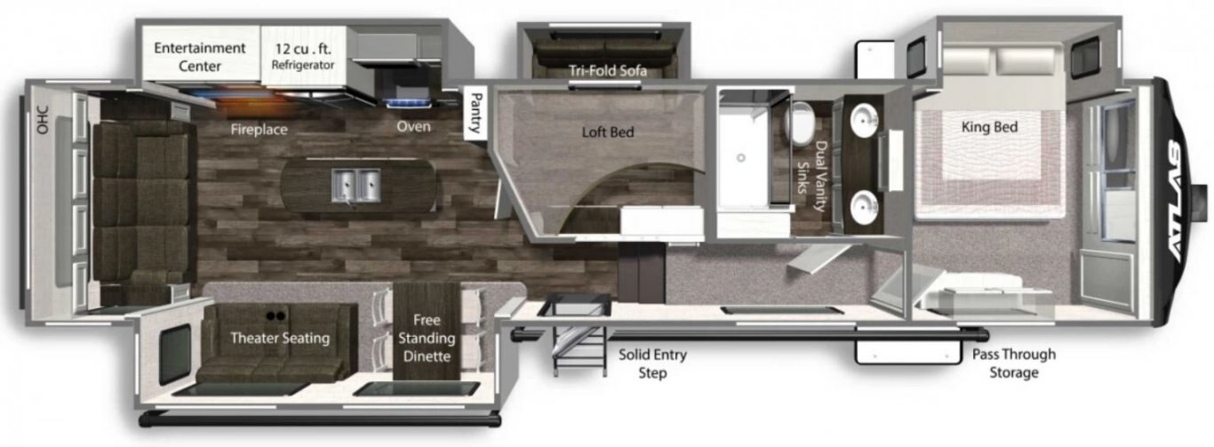 Getting ready for your next on- and off-road adventure? Why not let Atlas be your guide? These modern and fully-featured fifth-wheel RVs have been designed to give families space to live and play during long stretches on America’s roadways. Plus, they’re packed with the amenities that matter to travelers most, like expansive living spaces, inviting residential furniture, and kitchens loaded with top-of-the-line appliances.