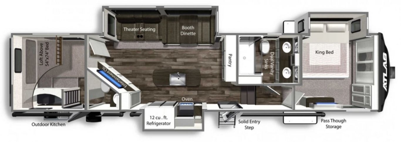 Getting ready for your next on- and off-road adventure? Why not let Atlas be your guide? These modern and fully-featured fifth-wheel RVs have been designed to give families space to live and play during long stretches on America’s roadways. Plus, they’re packed with the amenities that matter to travelers most, like expansive living spaces, inviting residential furniture, and kitchens loaded with top-of-the-line appliances.