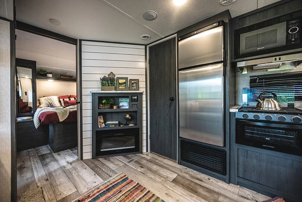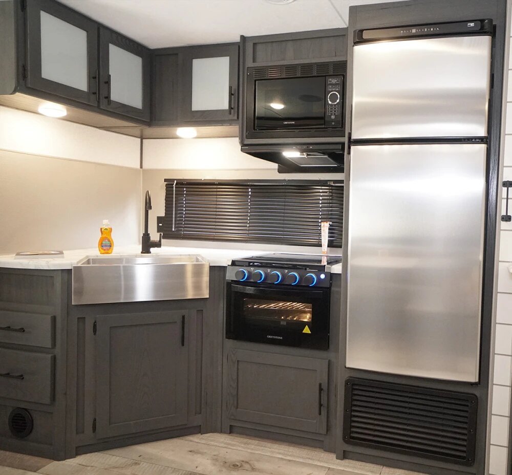 Forget RV kitchens of the past. With the seamless countertops and sink covers in these travel trailers, you’ll have more than enough room to get around, cook up a storm, and serve the whole family a meal they'll remember.