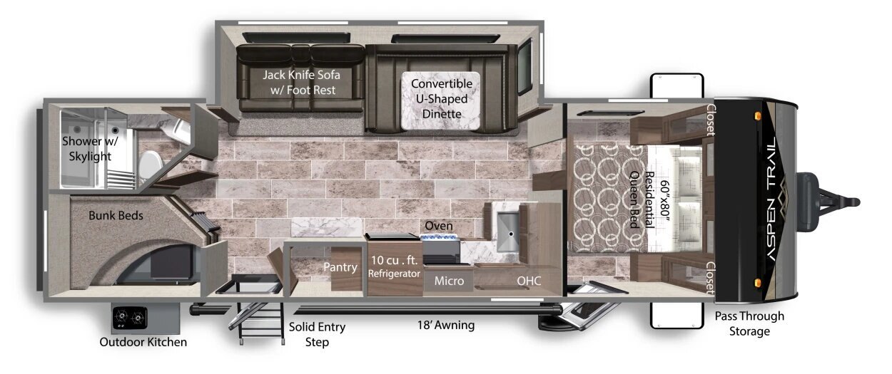 Aspen Trail has the most dynamic range of floorplan options to fit any camping style. With more standard features than its competitors and a focus on quality, value, and design, Aspen Trail delivers the best RV in its class.