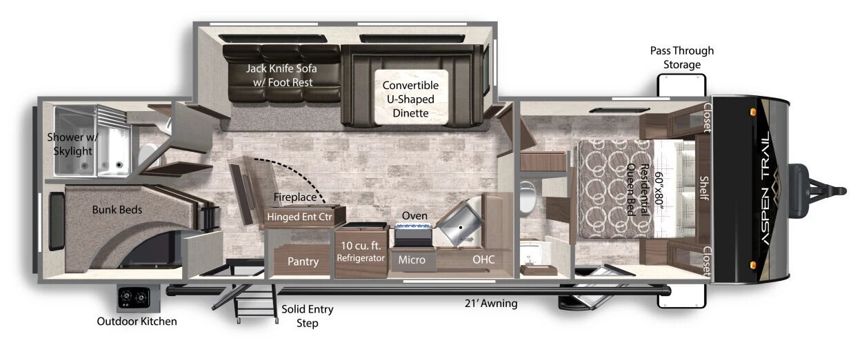 The Aspen Trail features the only U-shape dinette in its class that converts to a regular non-U-dinette when you need it. This multi-function dinette configuration ensures you’ll have space to enjoy every meal, while offering a place to nap, play, or simply put your legs up.