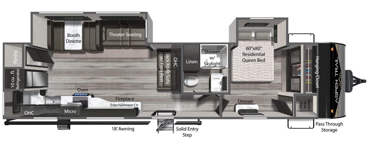 The Aspen Trail features the only U-shape dinette in its class that converts to a regular non-U-dinette when you need it. This multi-function dinette configuration ensures you’ll have space to enjoy every meal, while offering a place to nap, play, or simply put your legs up.