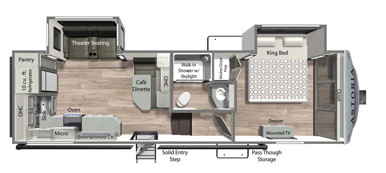The Astoria Fifth Wheel delivers a long list of standard features to elevate your RV travel, including the tallest bedroom height in the mid-pro fifth wheel segment. With more headroom to get ready and decompress, the Astoria is prepared to expand your exploration in more ways than one.