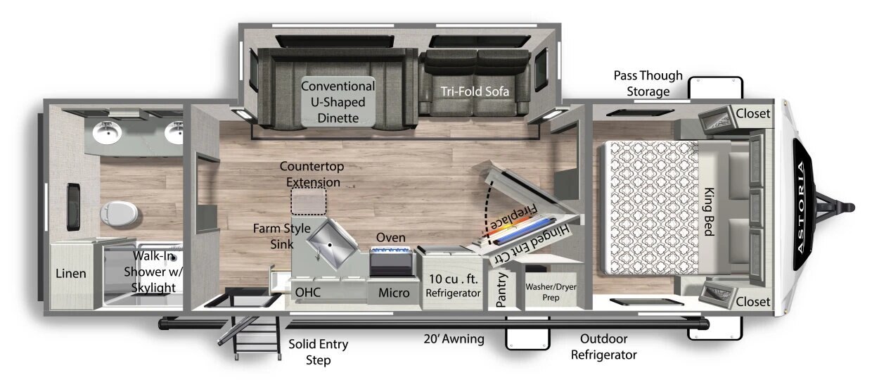 Whether your perfect getaway is a beach, mountains or big city, feel right at home in your Astoria Travel Trailer offering floor plans to fit your unique style.