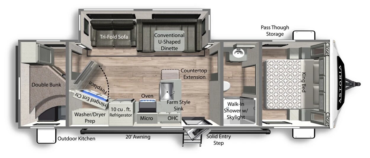 Whether your perfect getaway is a beach, mountains or big city, feel right at home in your Astoria Travel Trailer offering floor plans to fit your unique style.