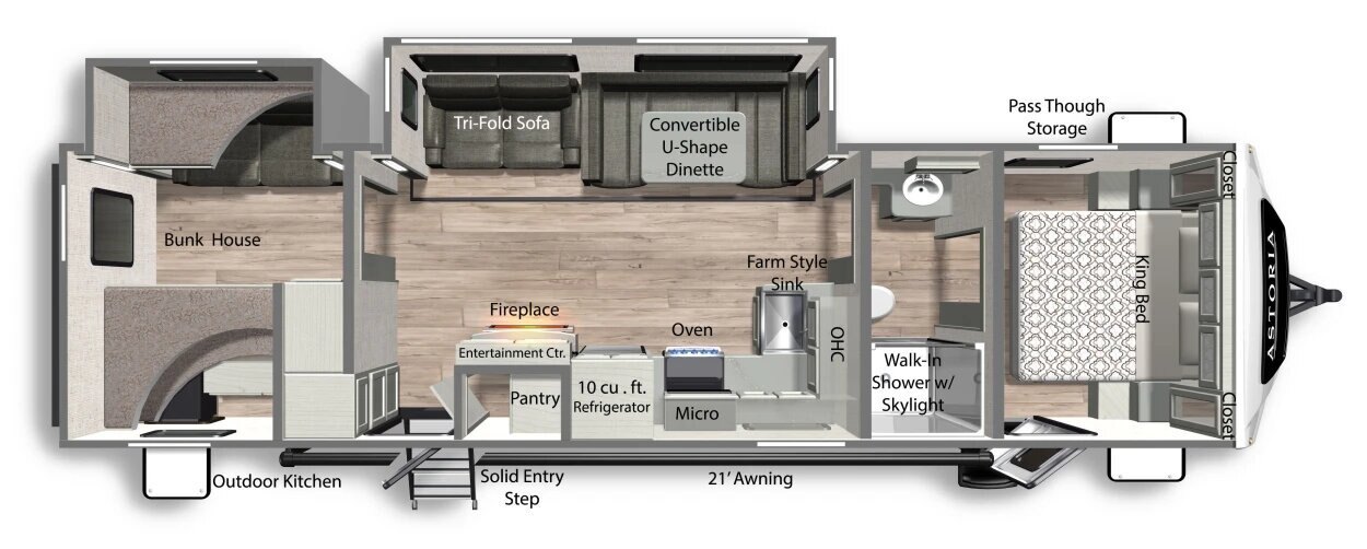 Whether your perfect getaway is a beach, mountains or big city, feel right at home in your Astoria Travel Trailer offering floor plans to fit your unique style.