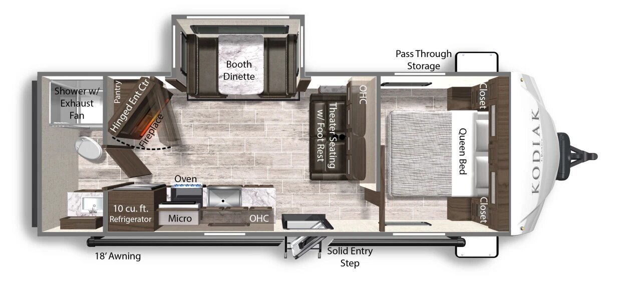 All the thrill of getting away combined with premium space and traditional comforts. That’s what a Queen-size bed brings to adventurers in every floorplan of our Kodiak Ultra-Lite travel trailers.